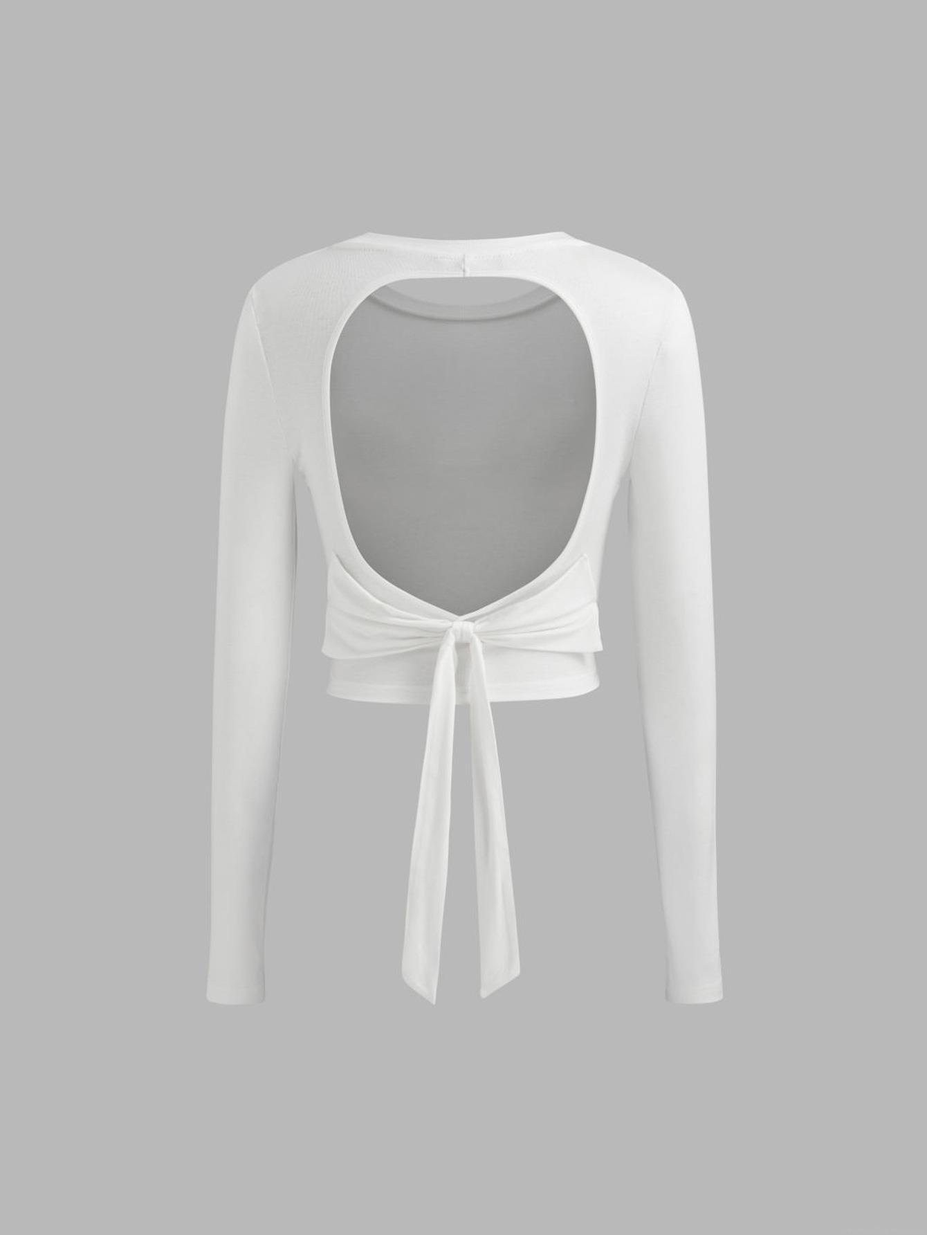 • Women Sexy Backless Long Sleeve Crop Top Slim Fit Round Neck White Viscose T-Shirt With Tie Back Bow Fashion Streetwear Party Dating Casual Wear