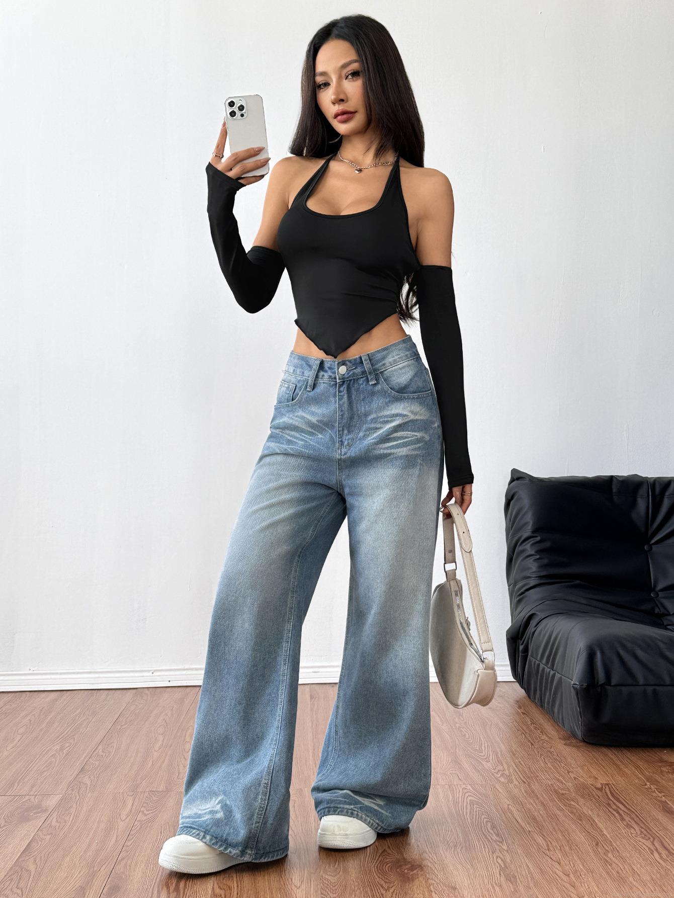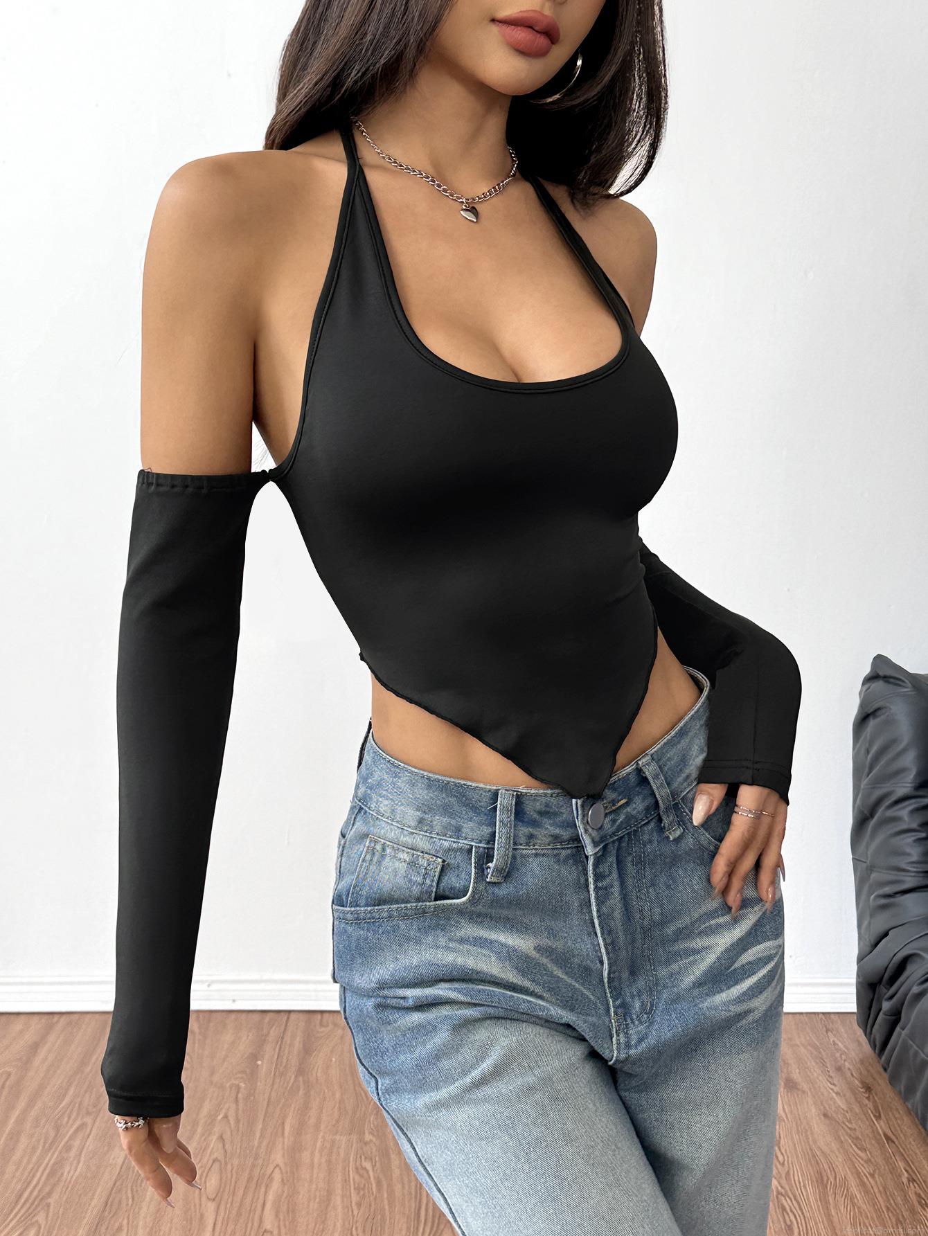 • Women Sexy Black Halter Crop Top with Detachable Long Sleeve Shrug Two-Piece Set Backless Slim Fit Streetwear Aesthetic Polyester Elastane Top