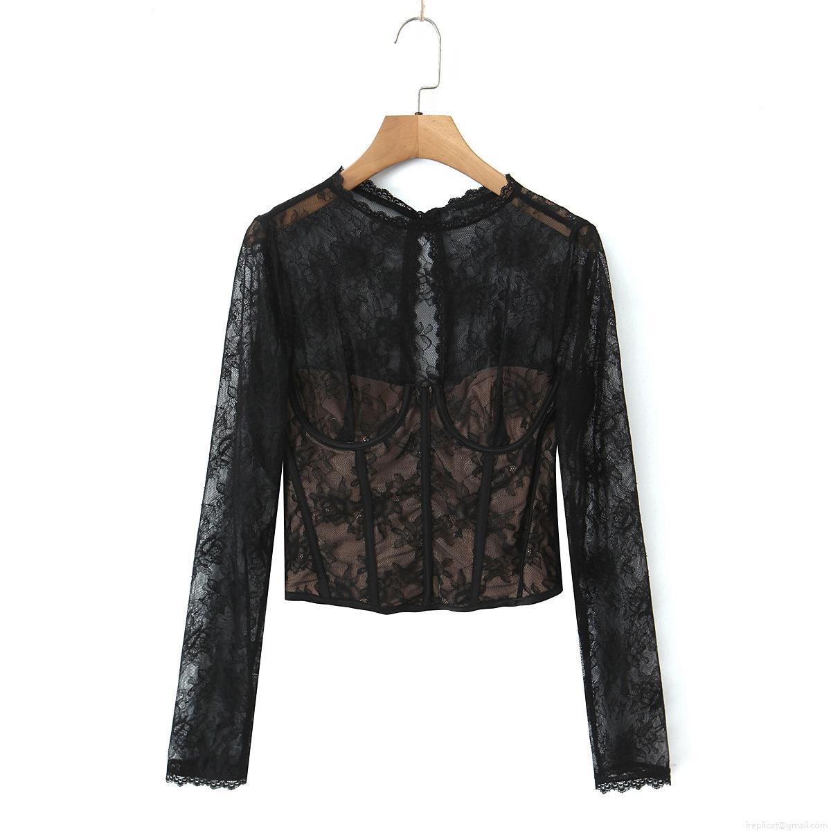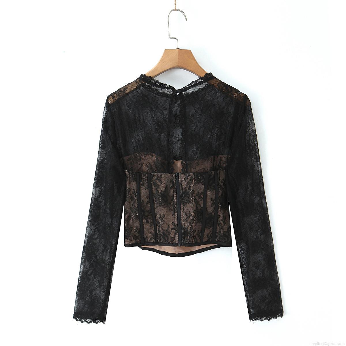• Women Sexy Black Lace Corset Top Long Sleeve See Through Mesh Floral Crochet Slim Fit Round Neck Bone Support Patchwork Contrast Lining Streetwear Party Blouse