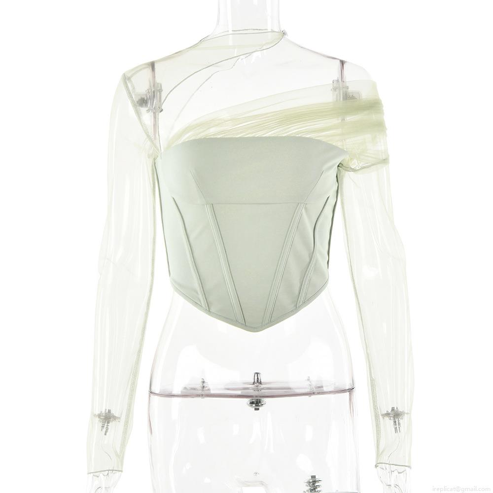 Women Sexy Corset Mesh Patchwork Tube Top Elegant Fishbone One Shoulder Long Sleeve Blouse Summer Streetwear Party Clubwear Top