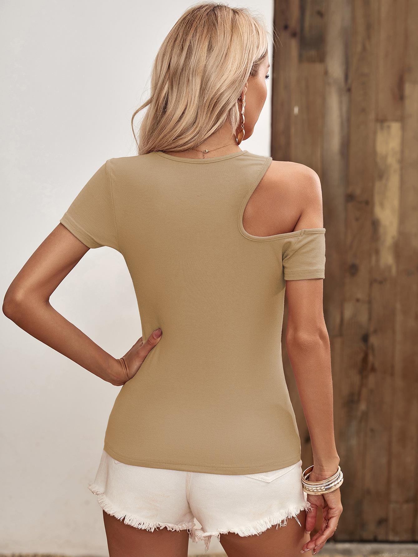 • Women Sexy Cut Out Shoulder T-Shirt Ribbed Knit Short Sleeve Slim Fit Top Khaki Viscose Elastane Summer Vacation Casual Tee For Ladies