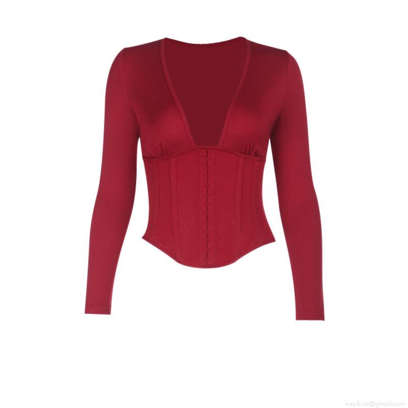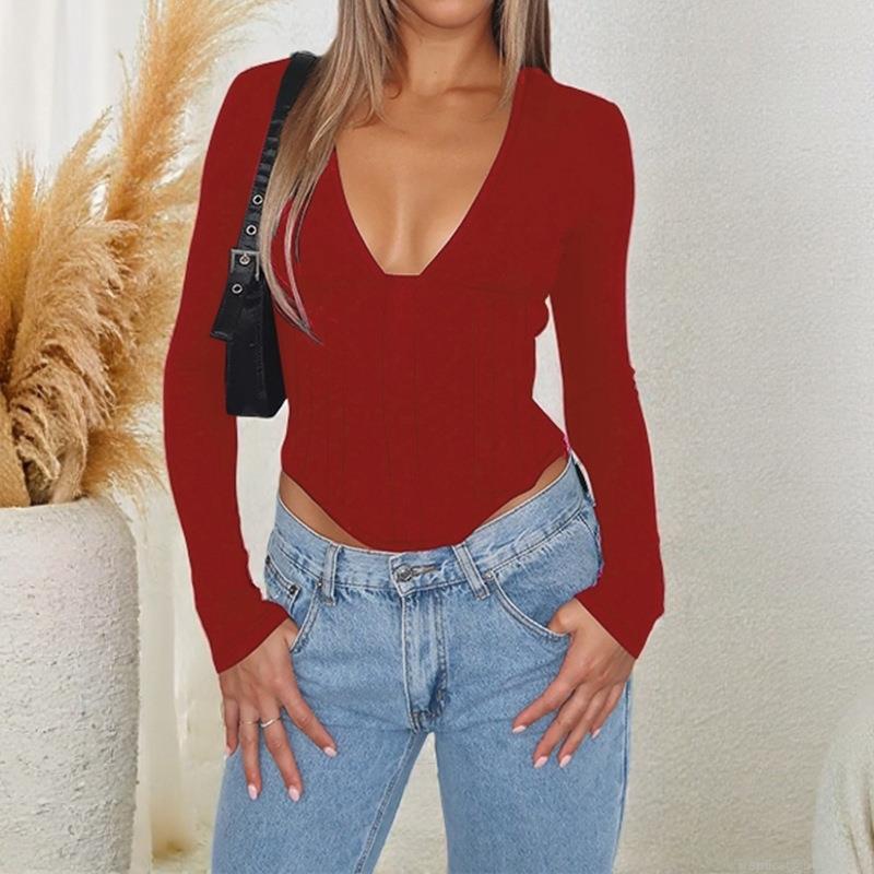• Women Sexy Deep V-Neck Long Sleeve T-Shirt Slim Fit Corset Style Fishbone Ribbed Knit Pullover Top For Streetwear Daily Dating Solid Color Sexy Clubwear