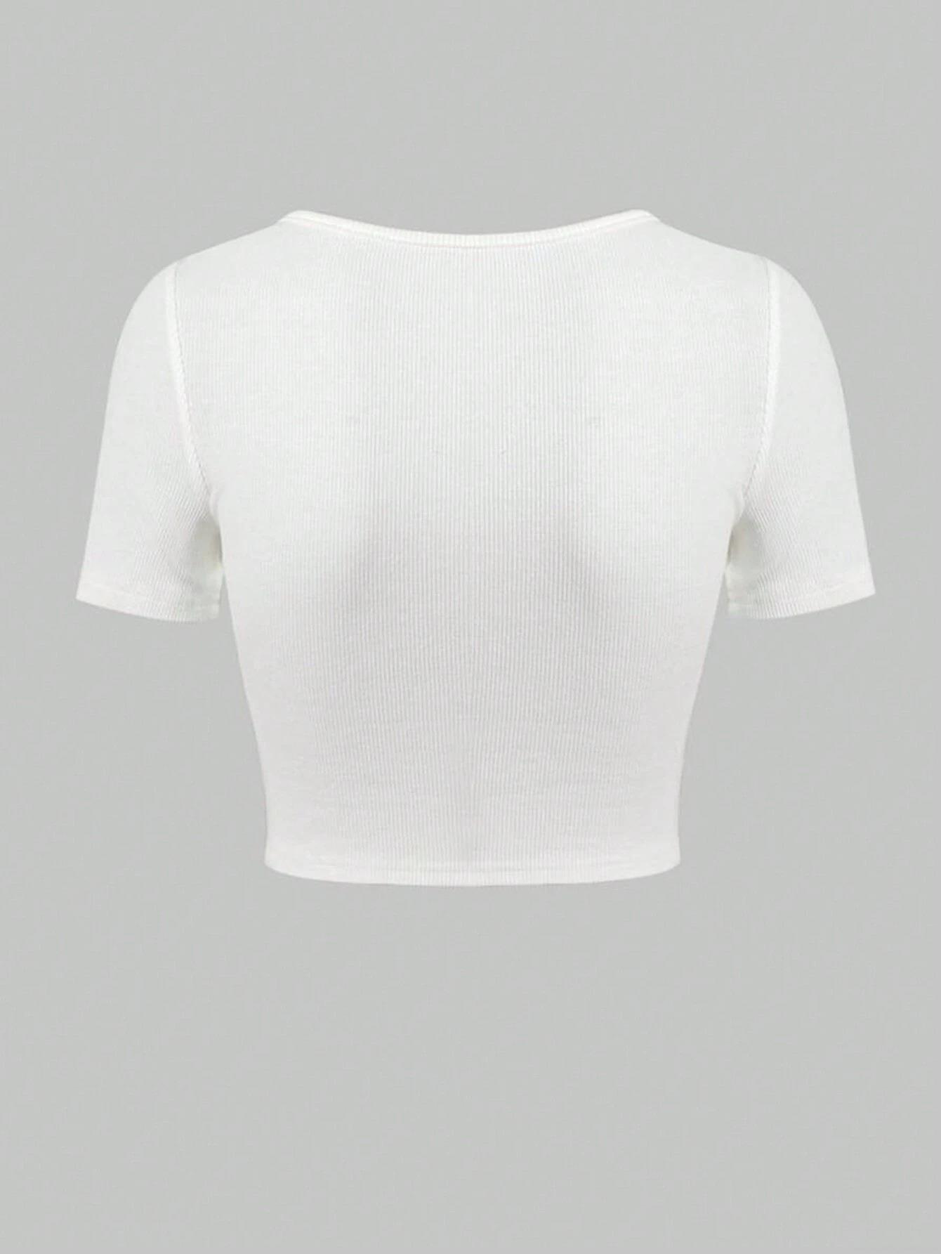 Women Sexy Deep V-Neck Ribbed Knit Crop Top Slim Fit Short Sleeve T-Shirt with Metal Buckle Summer Solid Color Clubwear Tee