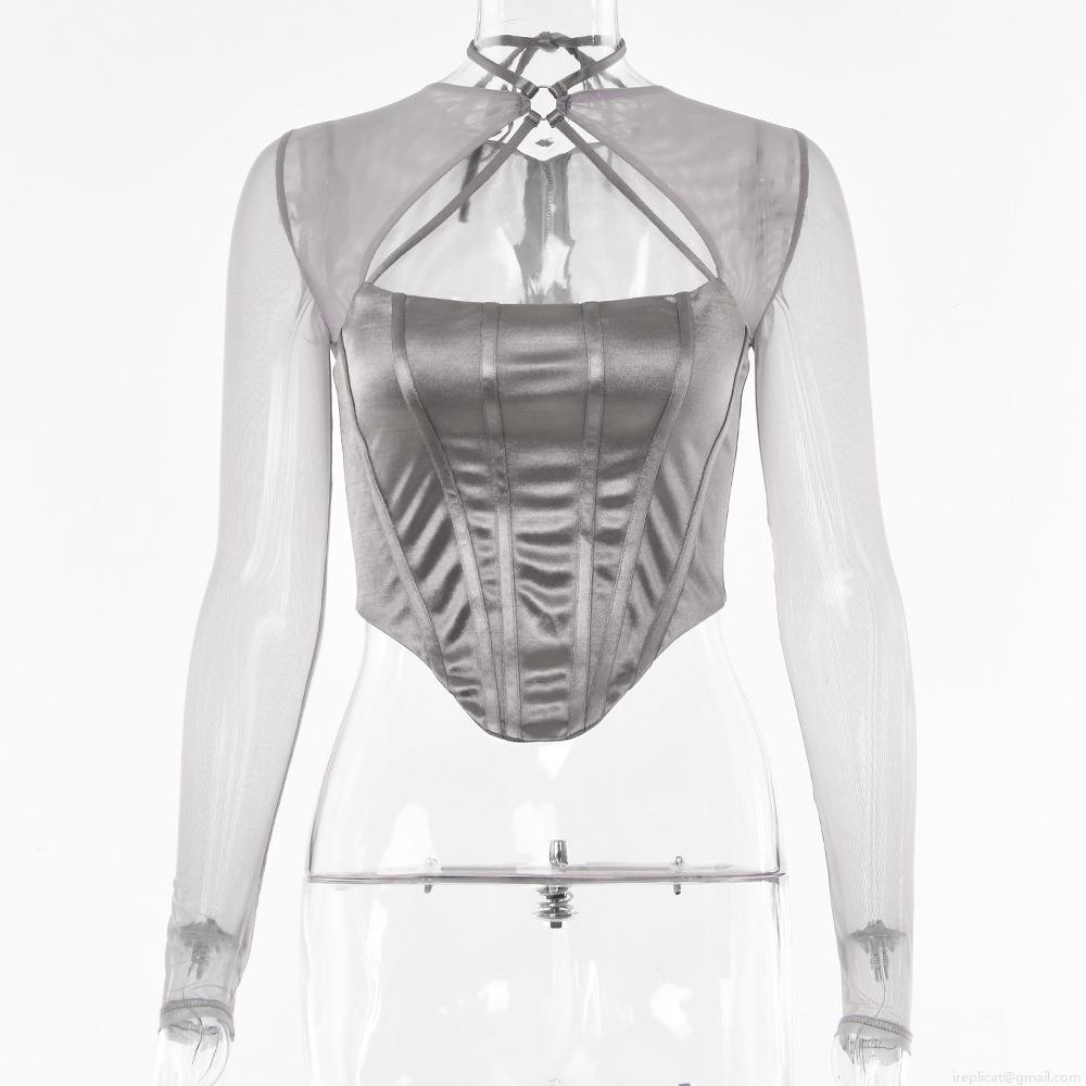 • Women Sexy Grey Mesh Patchwork T-Shirt Long Sleeve V Neck Sheer Corset Top With Halter Tie Up Backless Irregular Hem Streetwear For Party Club