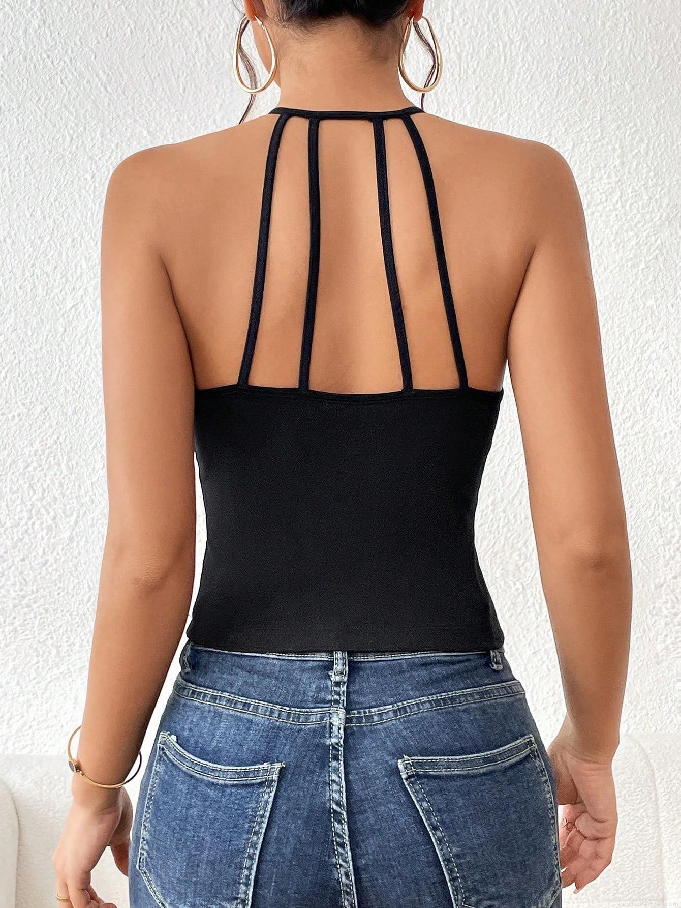 • Women Sexy Halter Backless Cut Out Crop Top Polyester Elastane Slim Fit Solid Black Streetwear Summer Sleeveless Tee For Dating Party