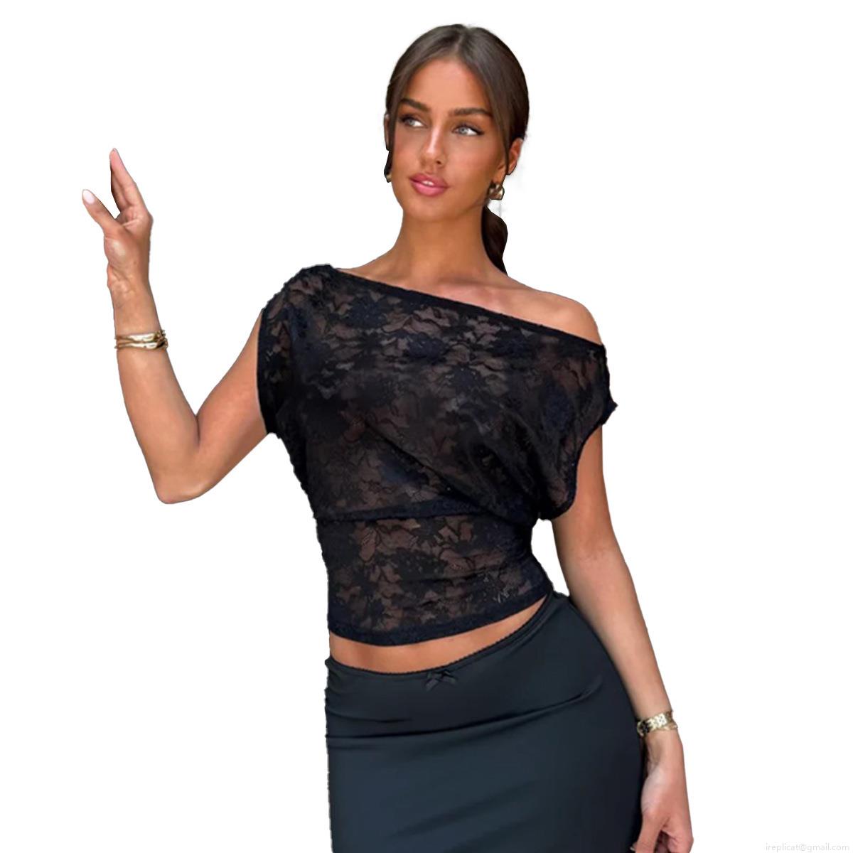 • Women Sexy Lace One Shoulder Top Hollow Out Asymmetric Short Sleeve Crop Top Floral Lace Polyester Shirt Clubwear Party Streetwear Slim Fit Blouse