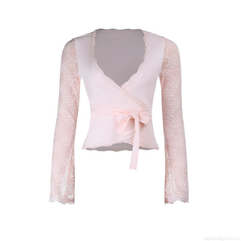 • Women Sexy Lace Patchwork Long Sleeve V Neck Wrap Top Pink Slim Fit Tie Front T-Shirt Party Clubwear Streetwear Lady Blouse