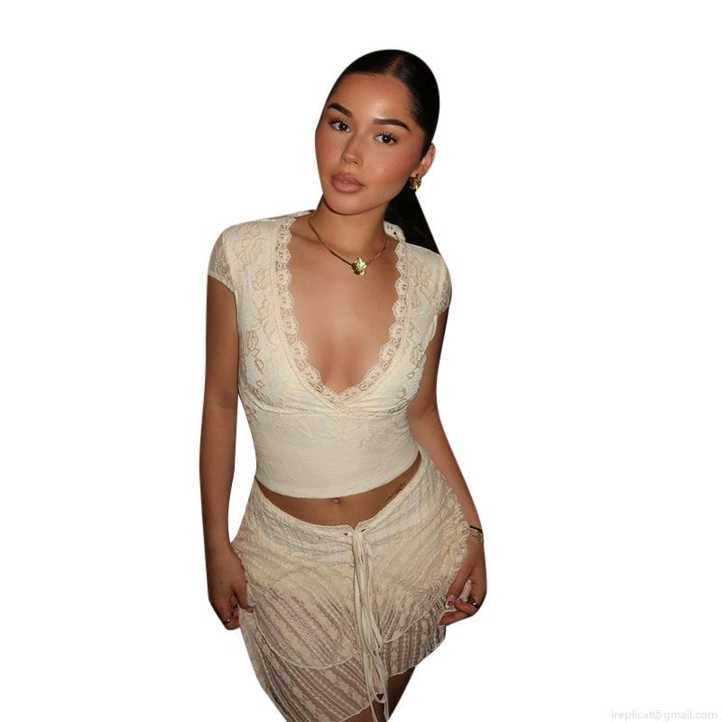 • Women Sexy Lace V-Neck Top Y2K Short Sleeve Slim Fit Polyester Hollow Out Crochet Blouse For Summer Beach Vacation Party