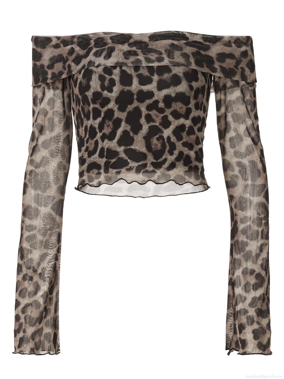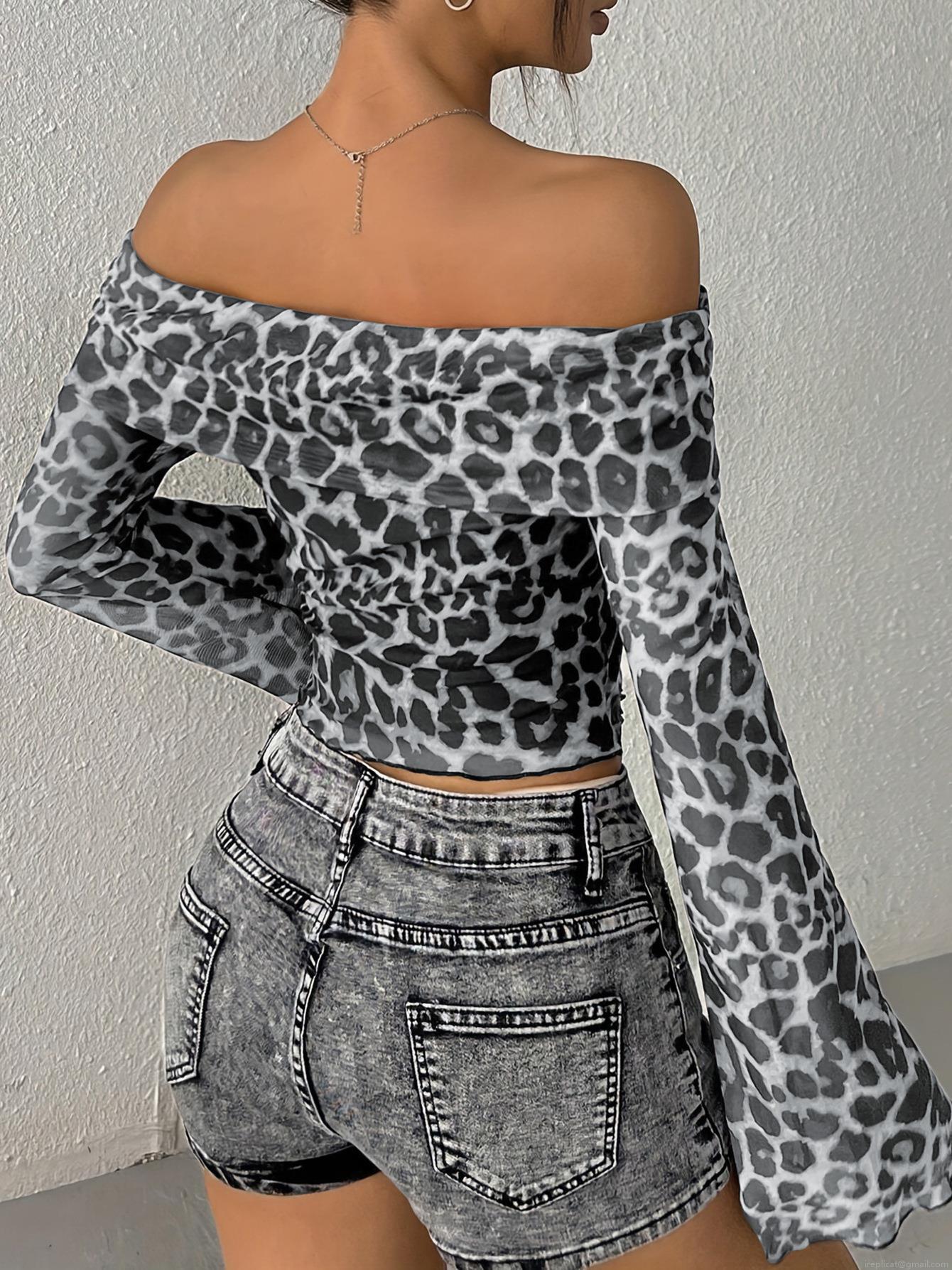 Leopard Print, Wood Ear Edge, Mesh, Navel Exposed, Perspective, Wavy Edge, Off-shoulder, Bell Sleeves