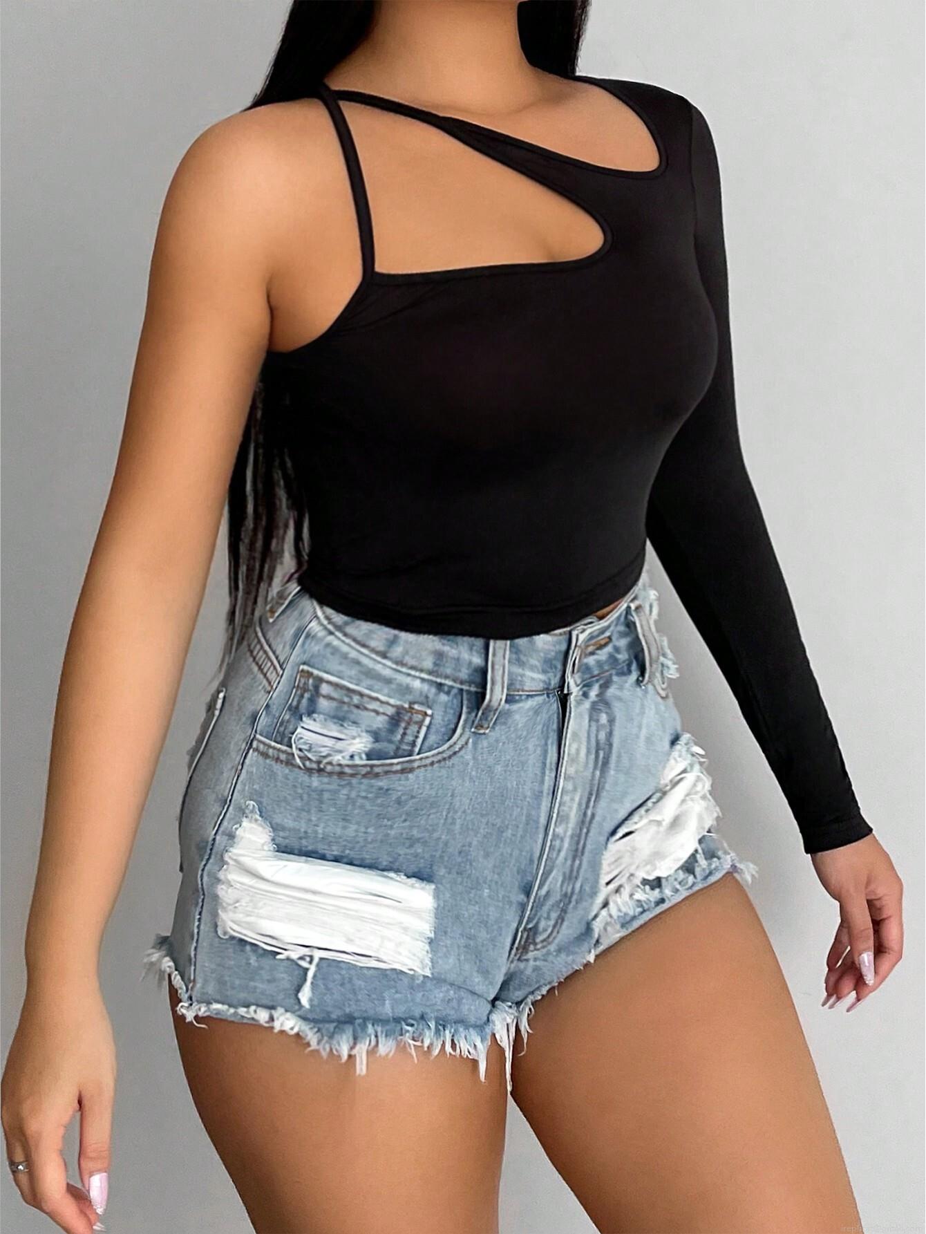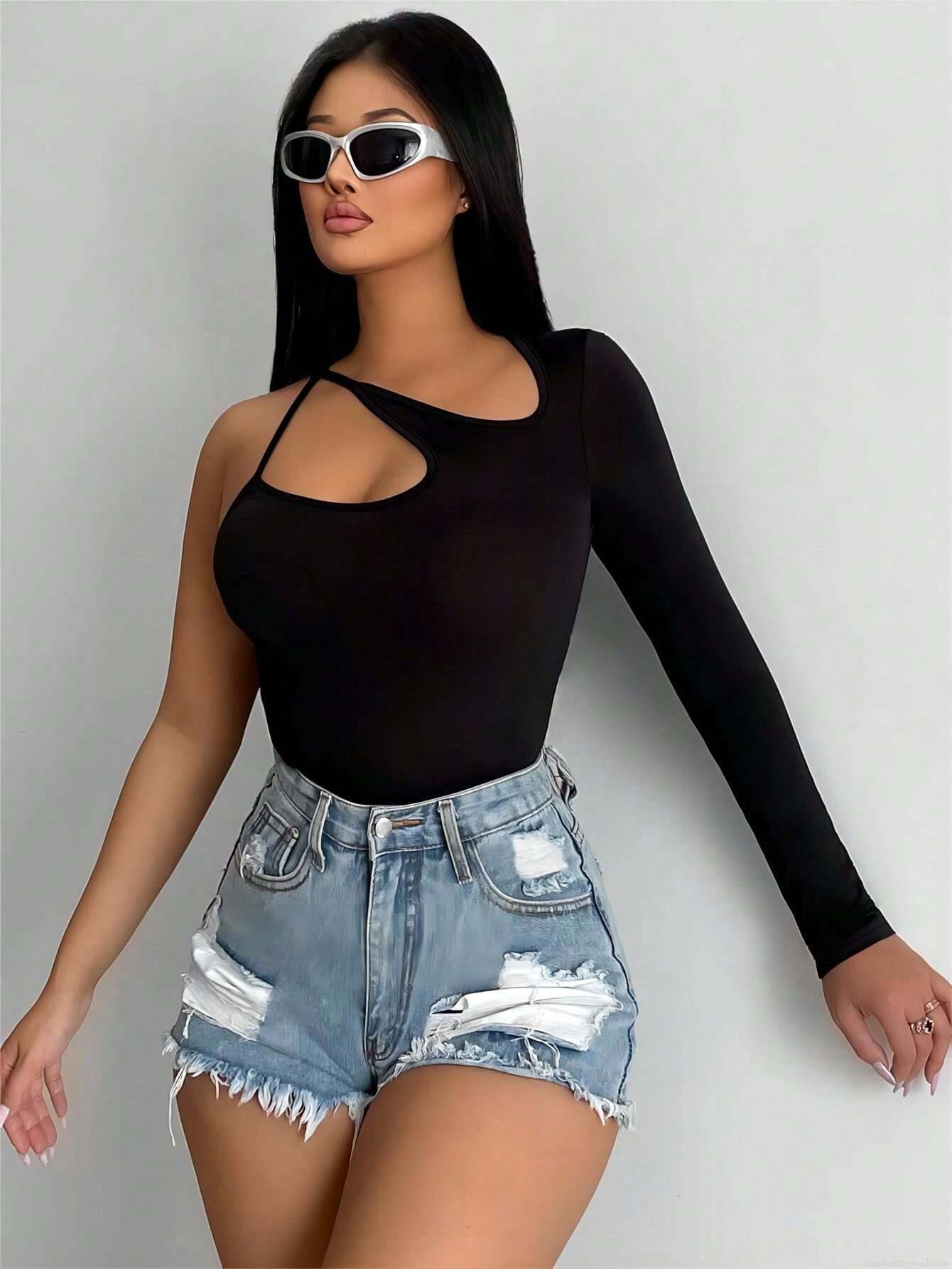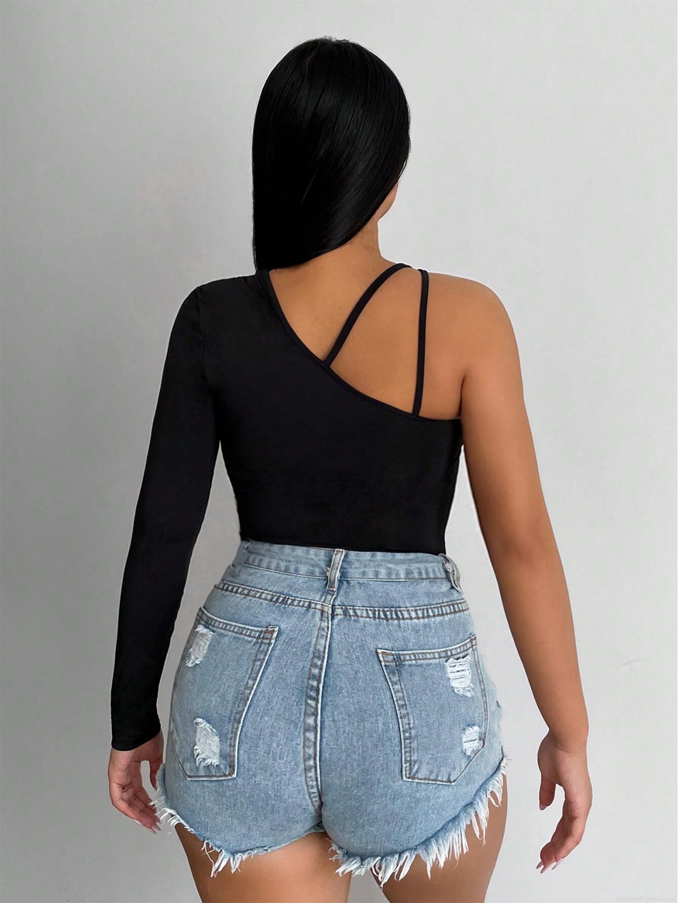 • Women Sexy Off Shoulder Hollow Out Asymmetric Long Sleeve T-Shirt Slim Fit Solid Color Polyester Elastane Streetwear Clubwear Fall Top