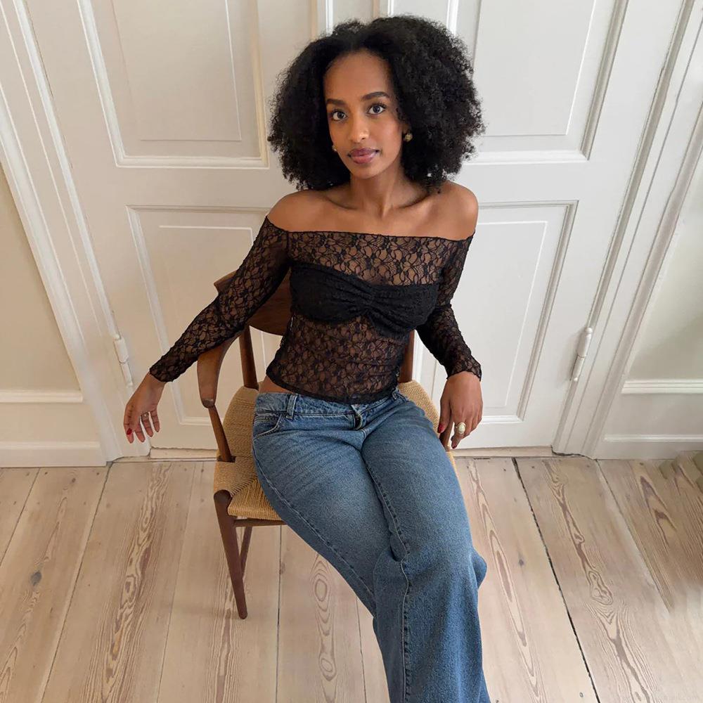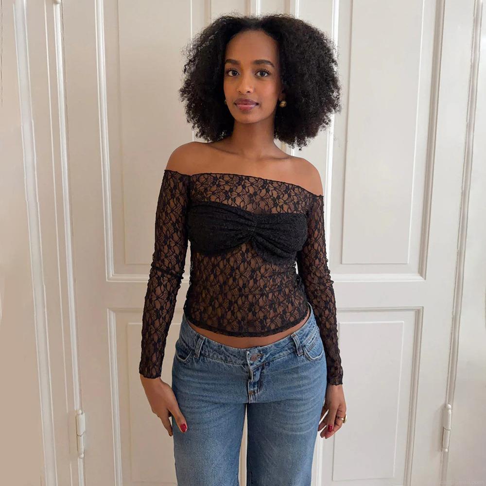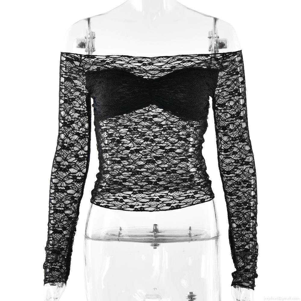 • Women Sexy Off Shoulder Lace Long Sleeve T-Shirt Slim Fit Sheer Perspective Backless Crop Top Patchwork Streetwear Y2K Party Clubwear Clothing