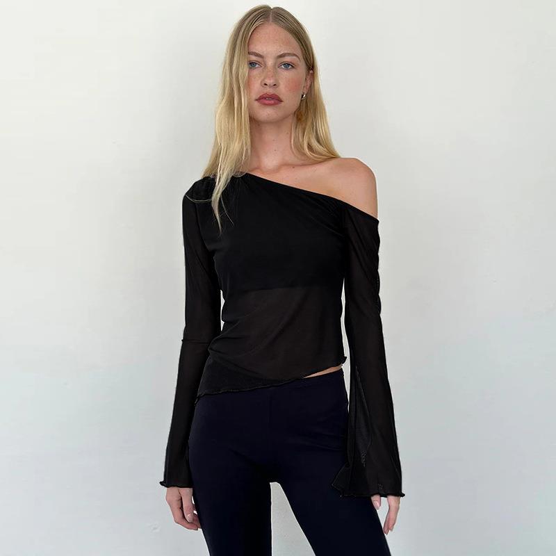 • Women Sexy Off Shoulder Mesh Top Asymmetric Slant Neck Long Sleeve Irregular Hem Slim Fit Pullover Blouse For Party Club Night Out Elegant Polyester Spandex Clothing