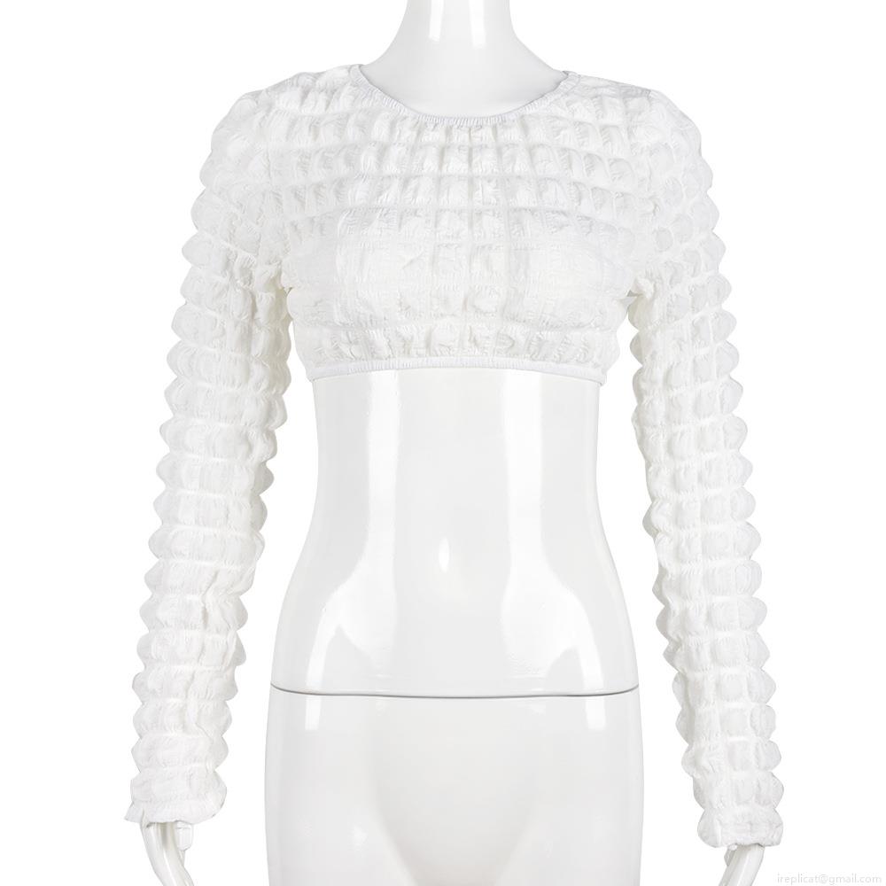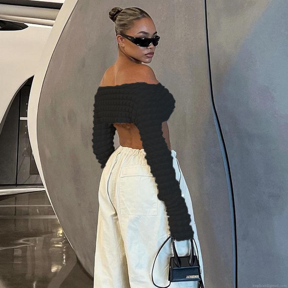 • Women Sexy Off Shoulder Popcorn Texture Crop Top Long Sleeve Slim Fit Solid Color Polyester T-Shirt Streetwear Clubwear Party Top