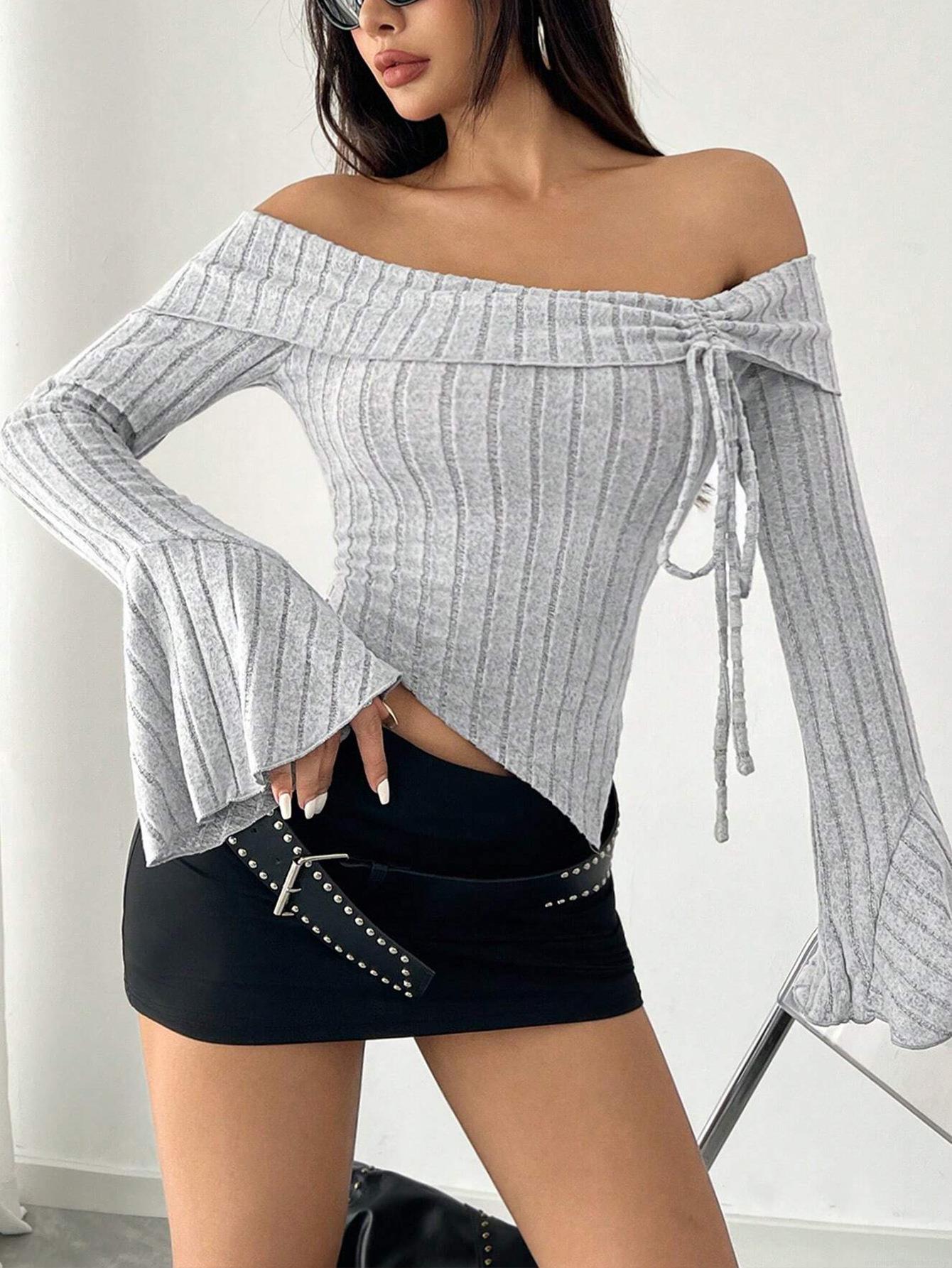 • Women Sexy Off Shoulder Rib Knit T-Shirt Flare Sleeve Drawstring Cropped Top Asymmetric Hem Streetwear Slim Fit Polyester Long Sleeve Pullover