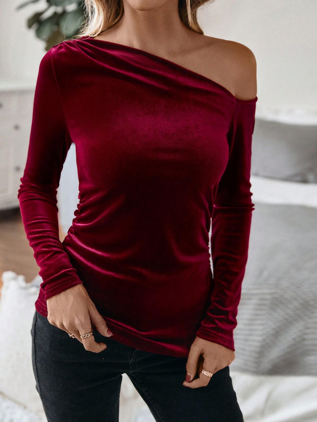 • Women Sexy Off Shoulder Velvet Long Sleeve T-Shirt Slim Fit Solid Wine Red Top Elegant Slant Neck Velvet Blouse For Autumn Winter Party Date Night Out Women Apparel