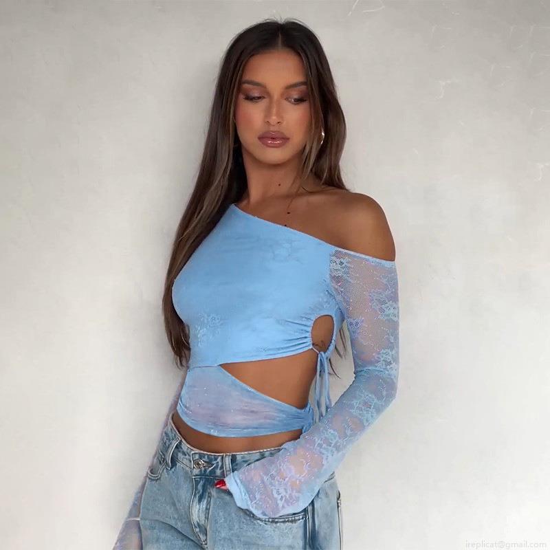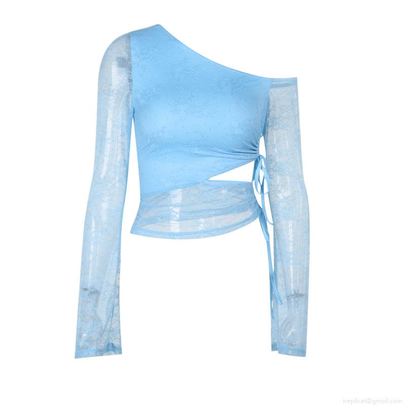 • Women Sexy One Shoulder Lace Long Sleeve Top Asymmetric Hollow Out Drawstring Slim Fit Polyester Spandex T-Shirt Fashion Light Blue Clubwear Party Blouse