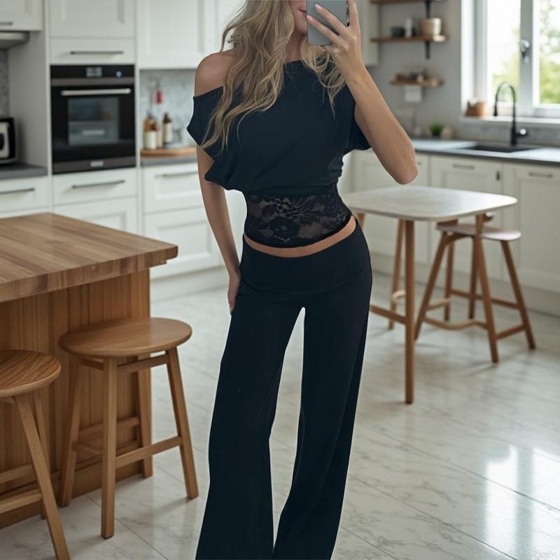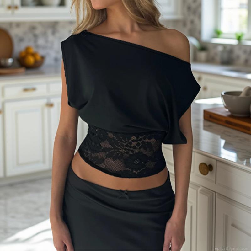Solid Color, Hollow Out, Navel Exposed, Sloping Shoulders, Lace Patchwork
