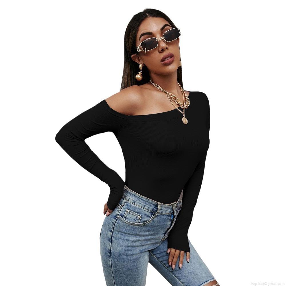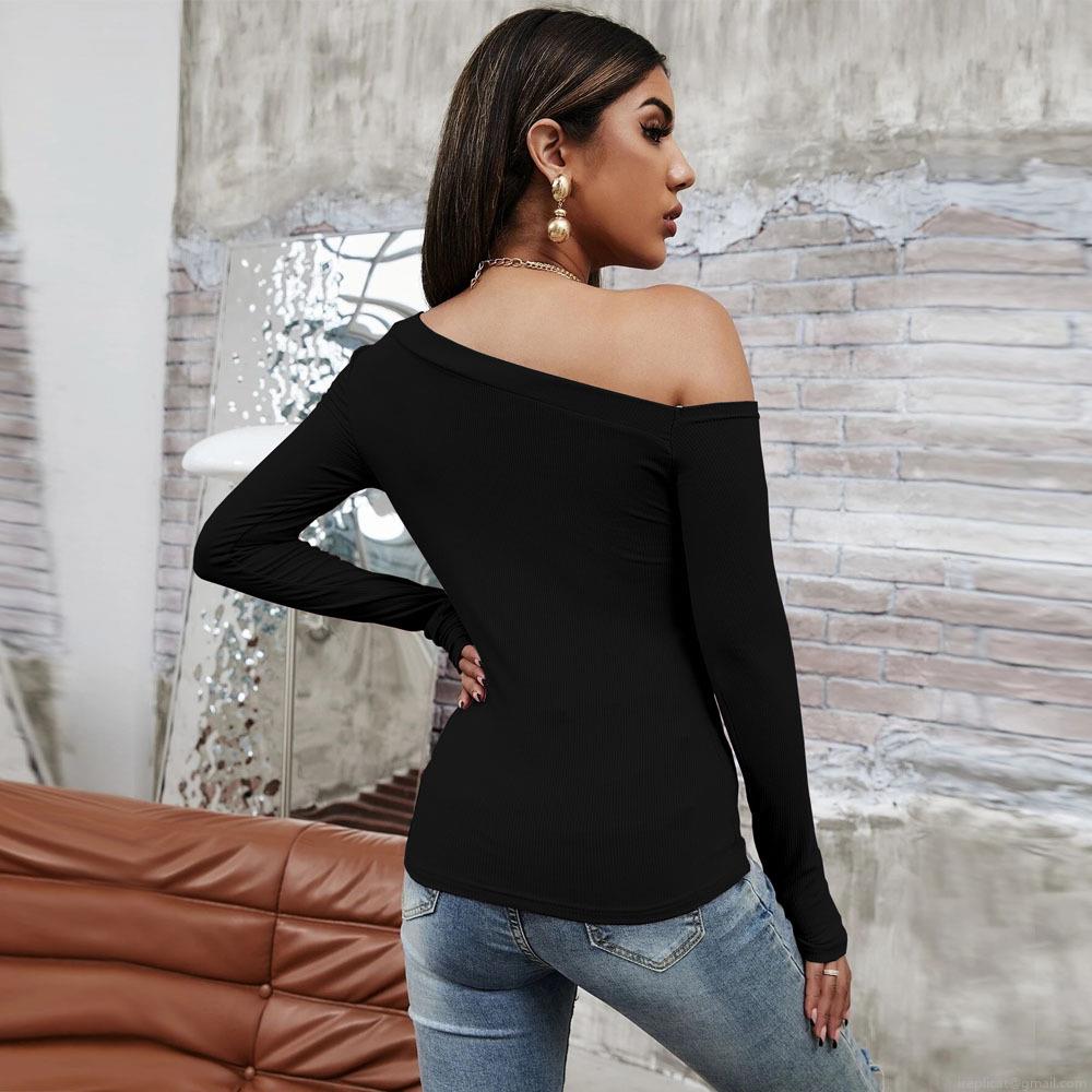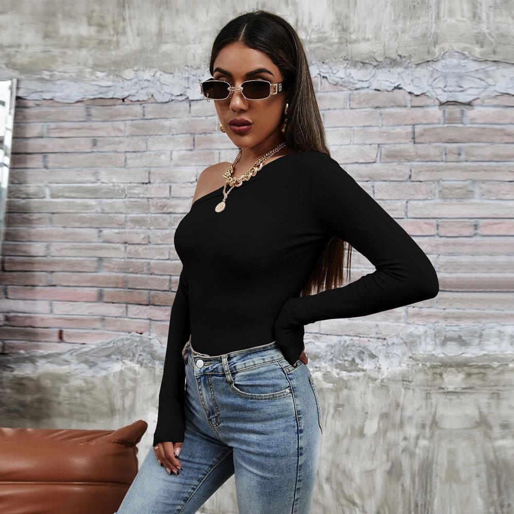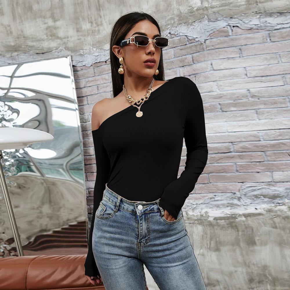 • Women Sexy One Shoulder Long Sleeve T-Shirt Ribbed Knit Slim Fit Irregular Neckline Off Shoulder Top Modern Y2K Aesthetic Daily Wear Black