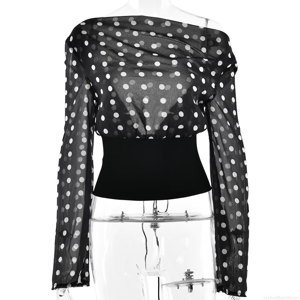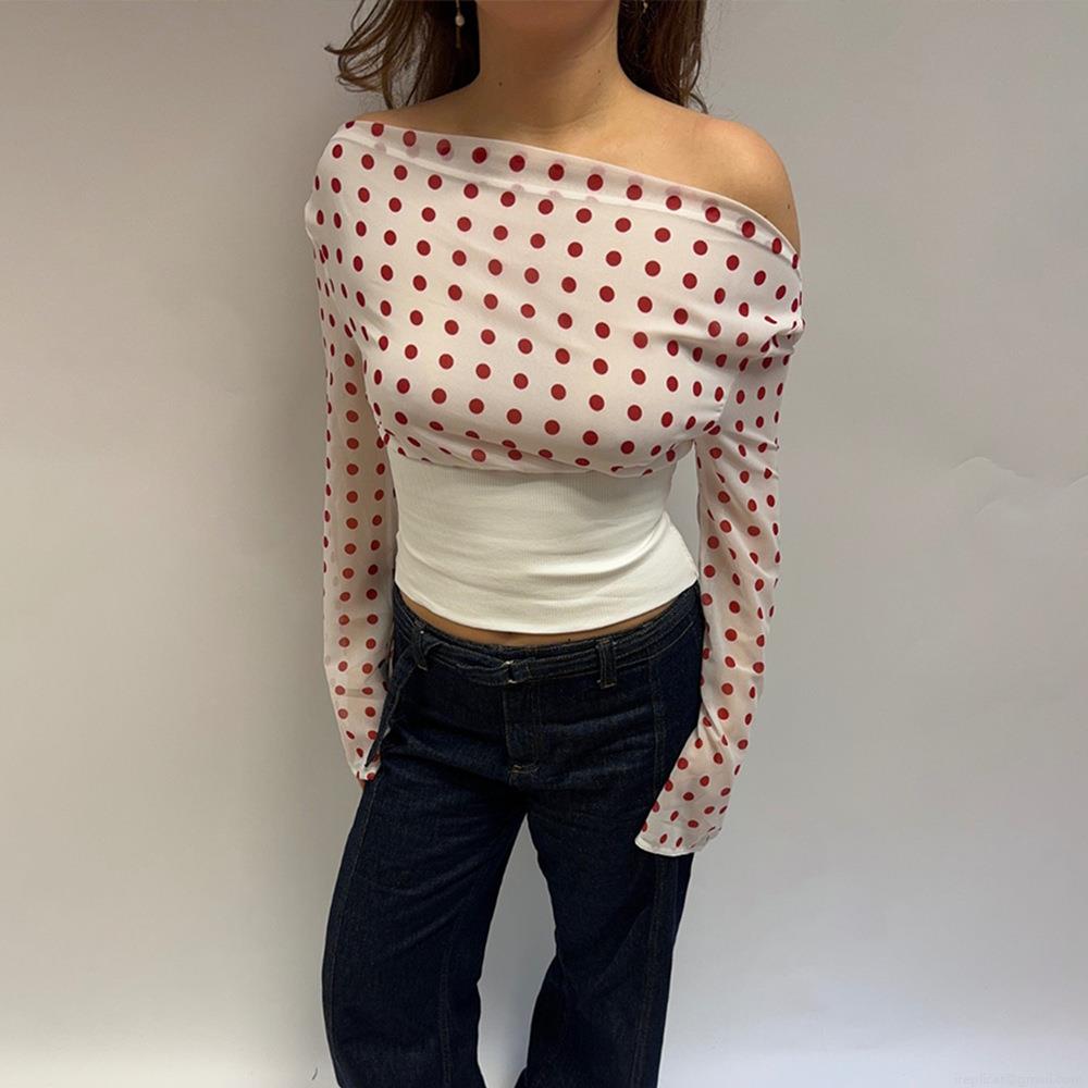 • Women Sexy Polka Dot Chiffon Top One Shoulder Long Mesh Sleeve Backless Lace Up Crop Top Y2K Streetwear Clubwear Shirt