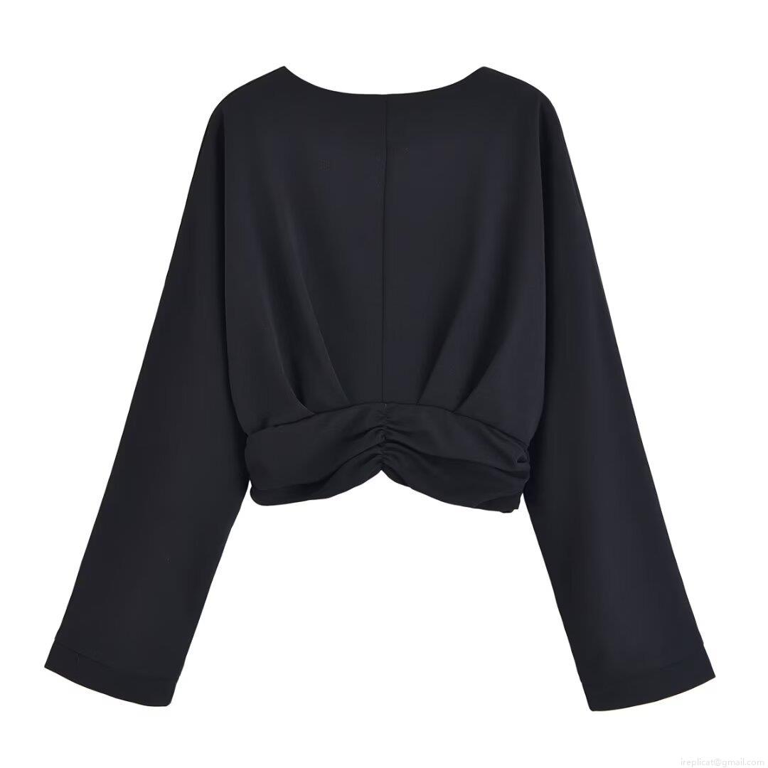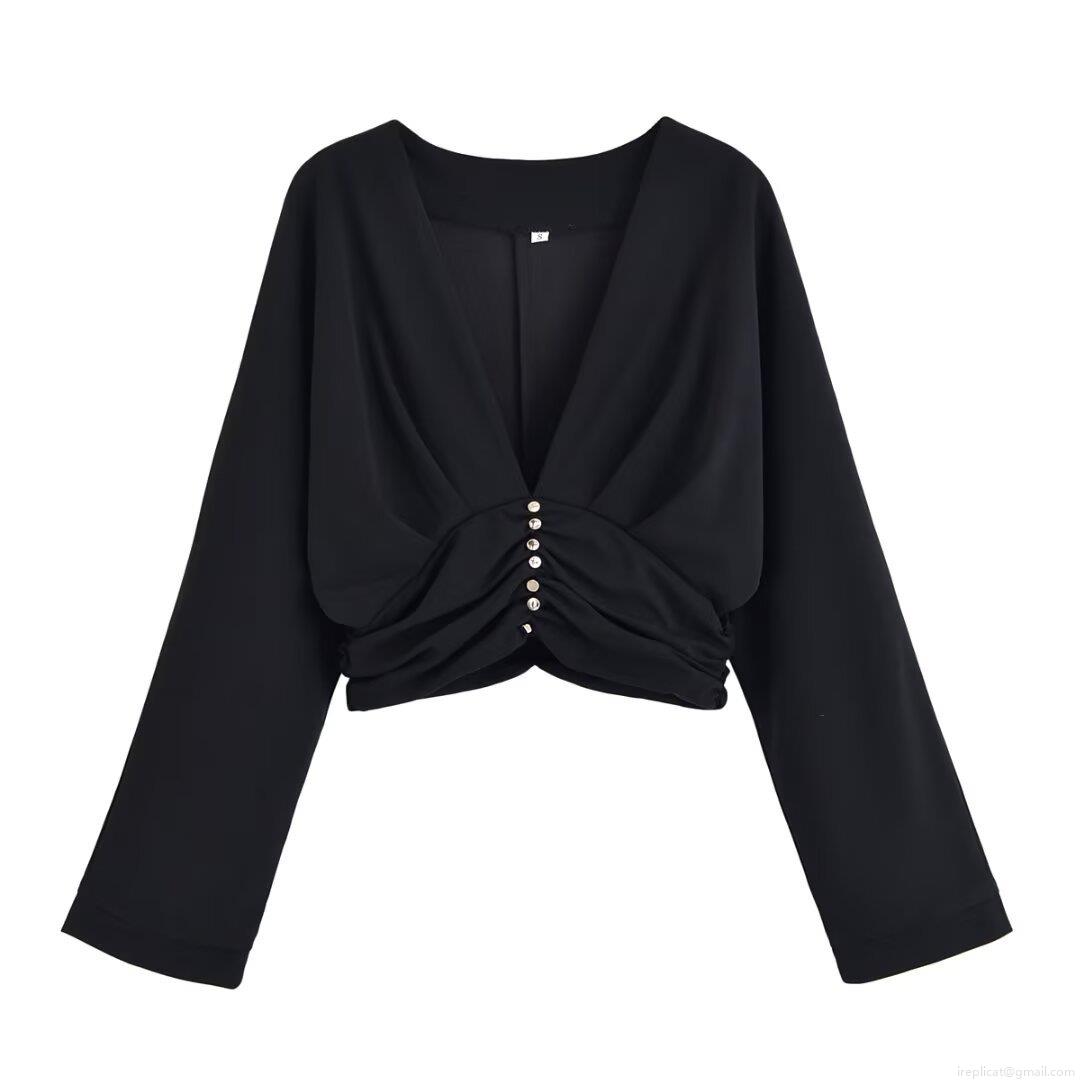 • Women Sexy Ruched V-Neck Long Sleeve Crop Top Polyester Button Front Solid Color Slim Fit Streetwear Fashion T-Shirt For Party Daily Club Wear