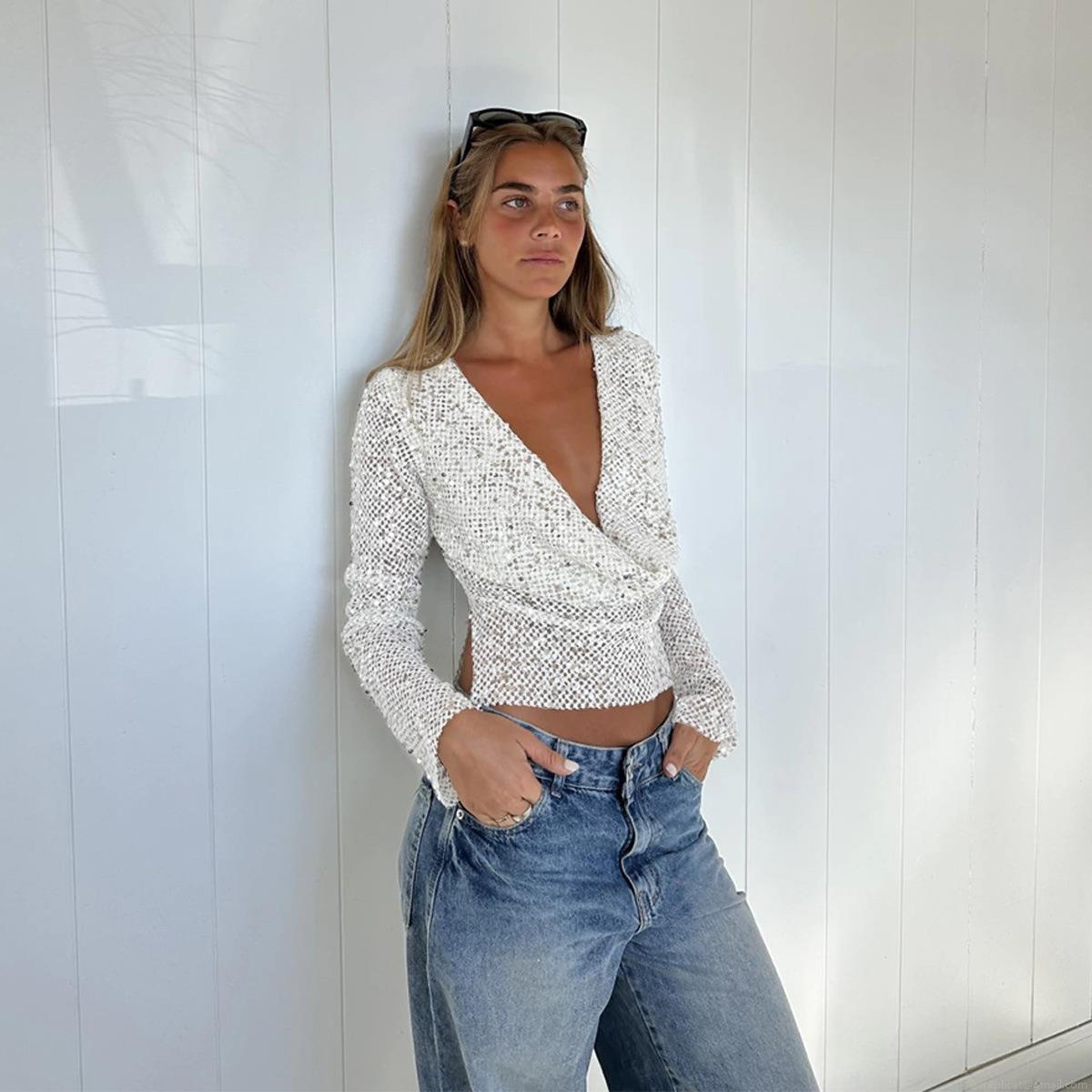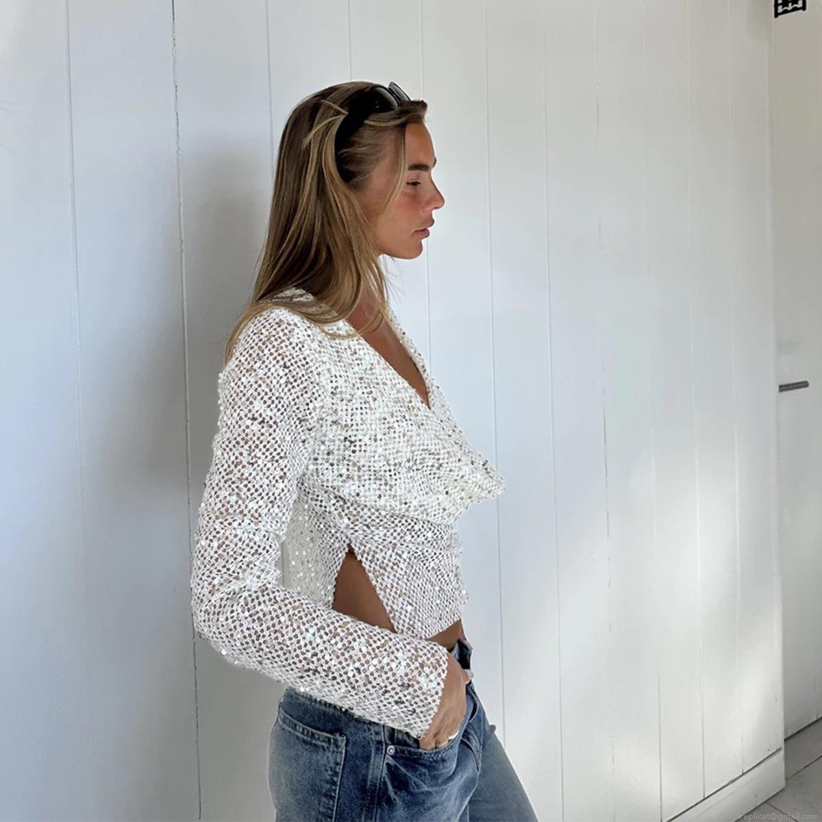 • Women Sexy Sequin Mesh Hollow Out Cowl Neck Long Sleeve T-Shirt Shiny Sheer Cropped Top Streetwear Clubwear Party Blouse