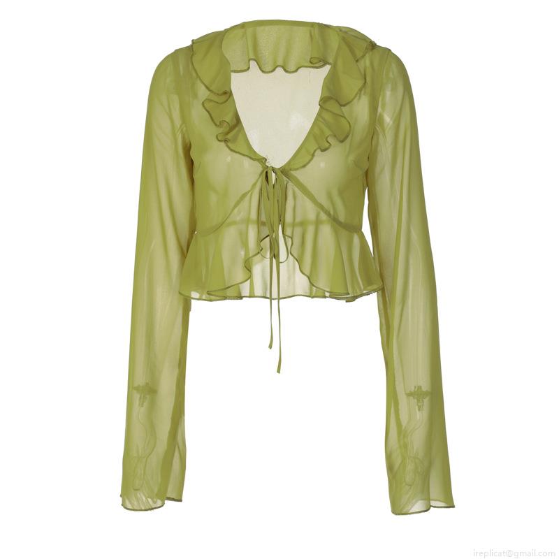 • Women Sexy Sheer Ruffle Top Deep V-Neck Tie-Front Long Sleeve Polyester Spandex Mesh Summer Streetwear Short Blouse Outfits