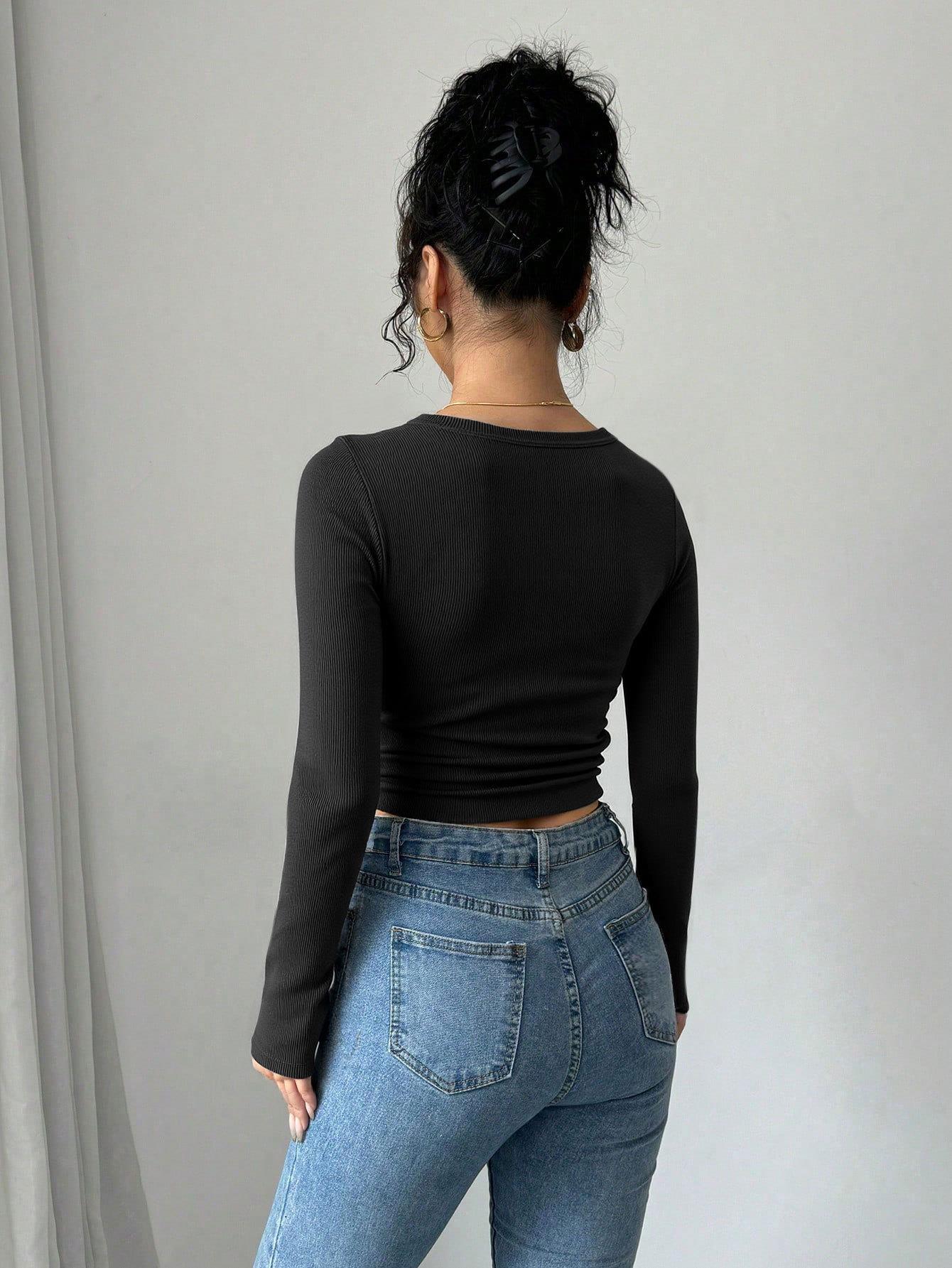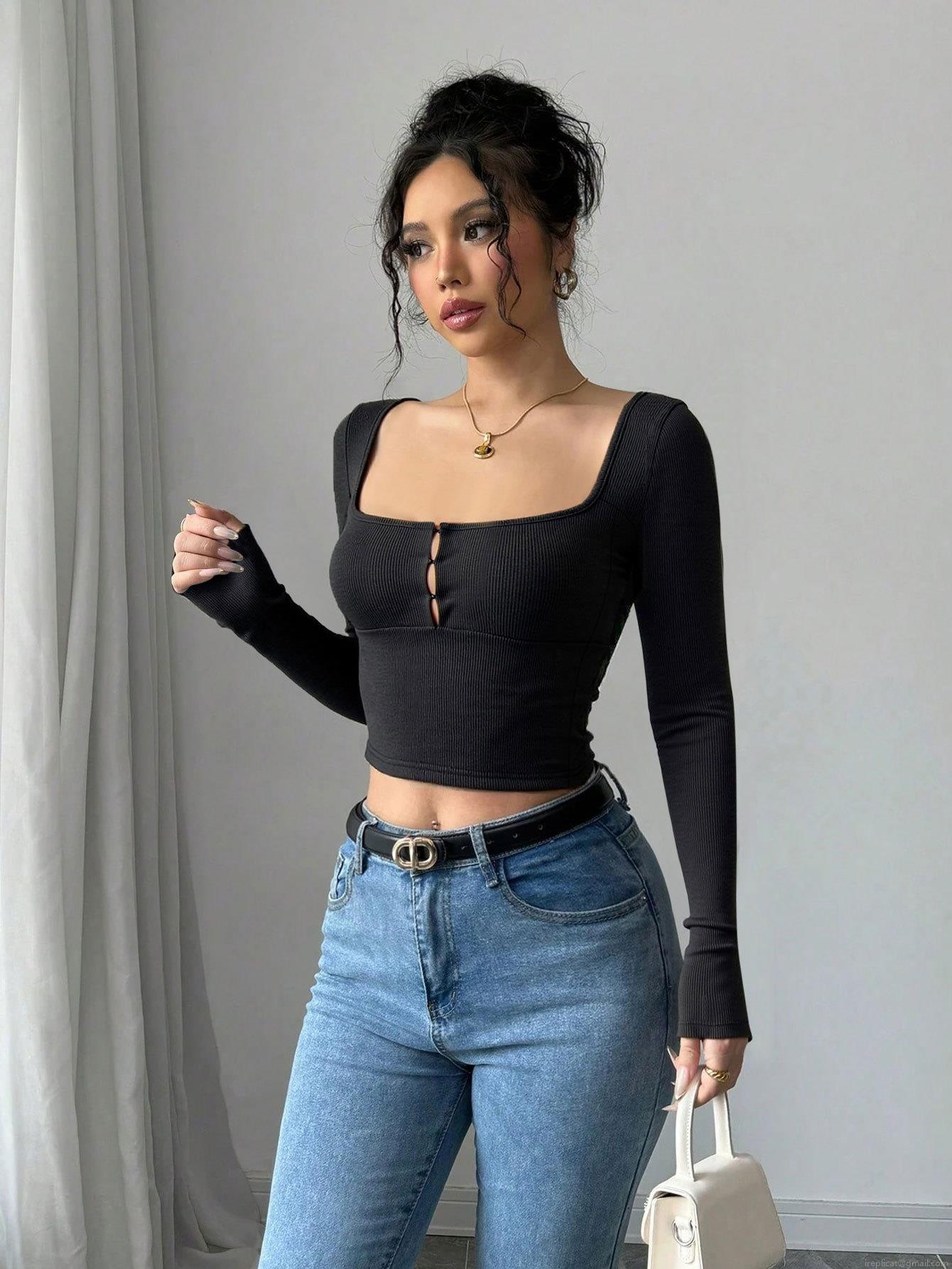• Women Sexy Square Neck Long Sleeve Rib-Knit Crop Top Polyester Elastane Slim Fit Stretch Button Cut Out T-Shirt For Club Streetwear