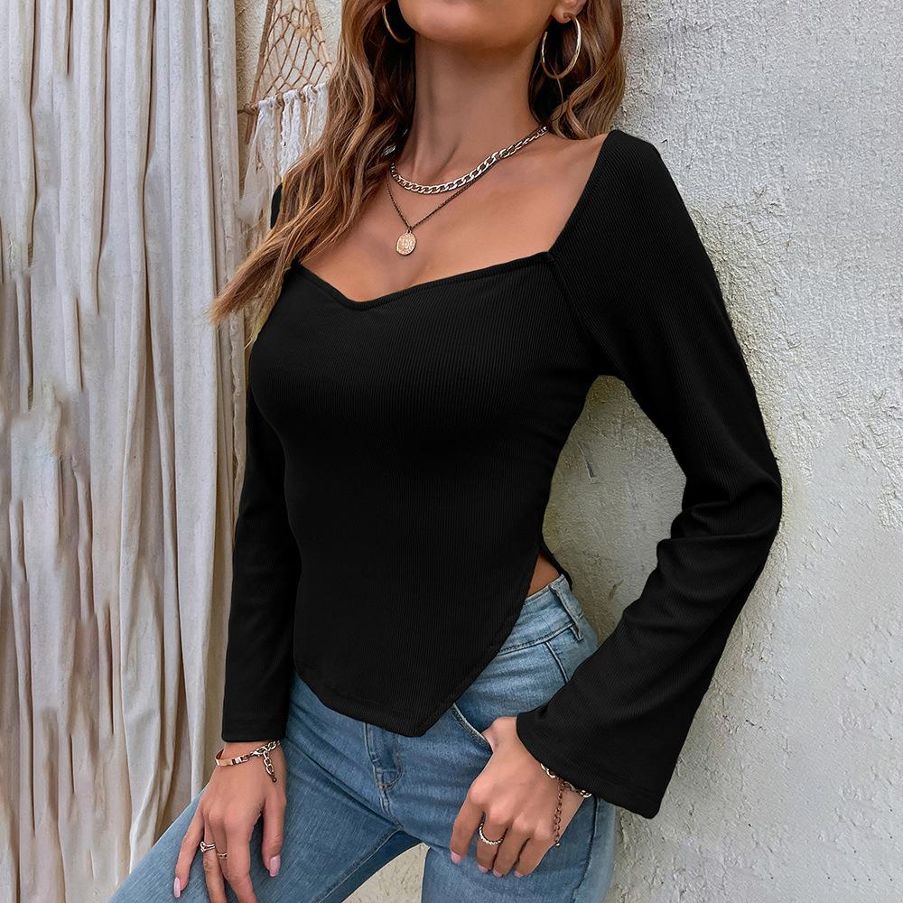 • Women Sexy Square Neck Ribbed Knit T-Shirt Slim Fit Long Sleeve Top With Irregular Hem And Bell Sleeves Rayon Polyester Spandex Blend Casual Chic Fashion Tee For Women