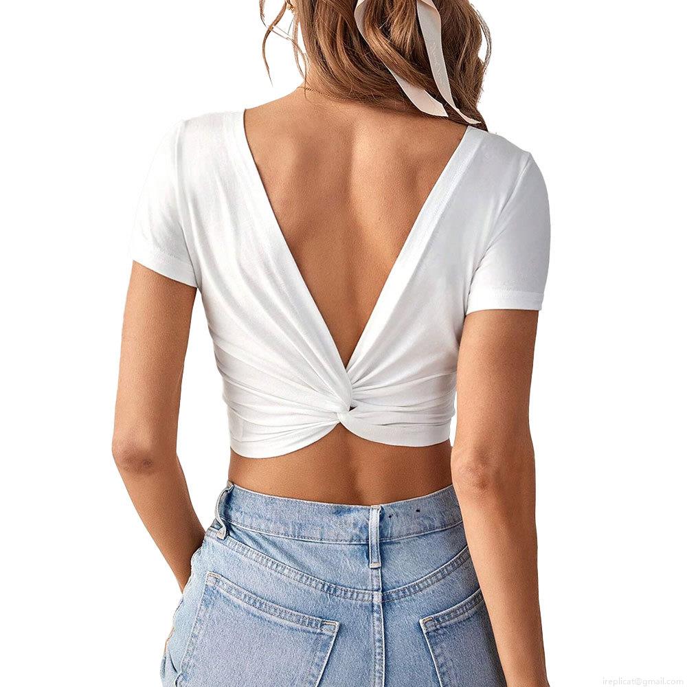 • Women Sexy V Neck Backless Crop Top Short Sleeve Twist Knot Solid Color Ribbed Cotton Blend Slim Fit T-Shirt For Fashion Streetwear Summer