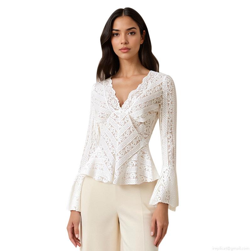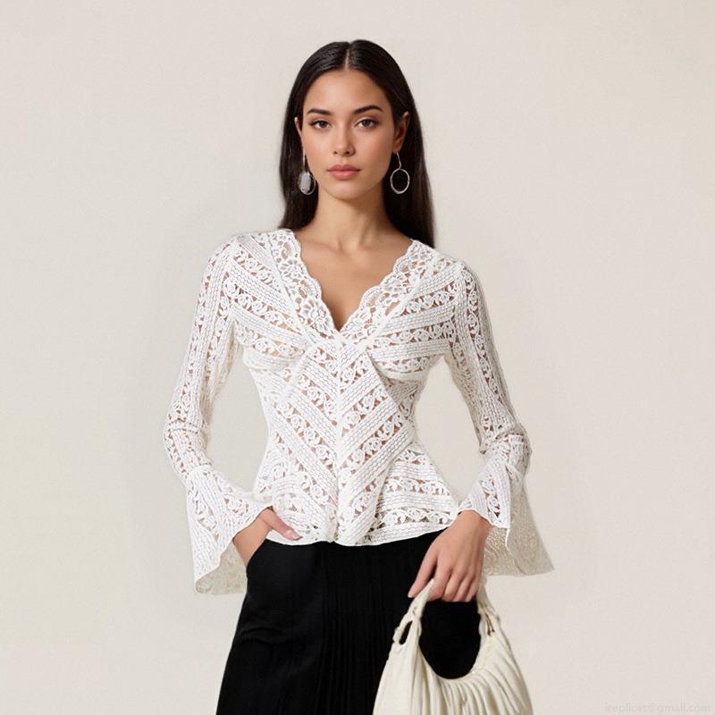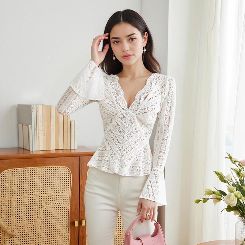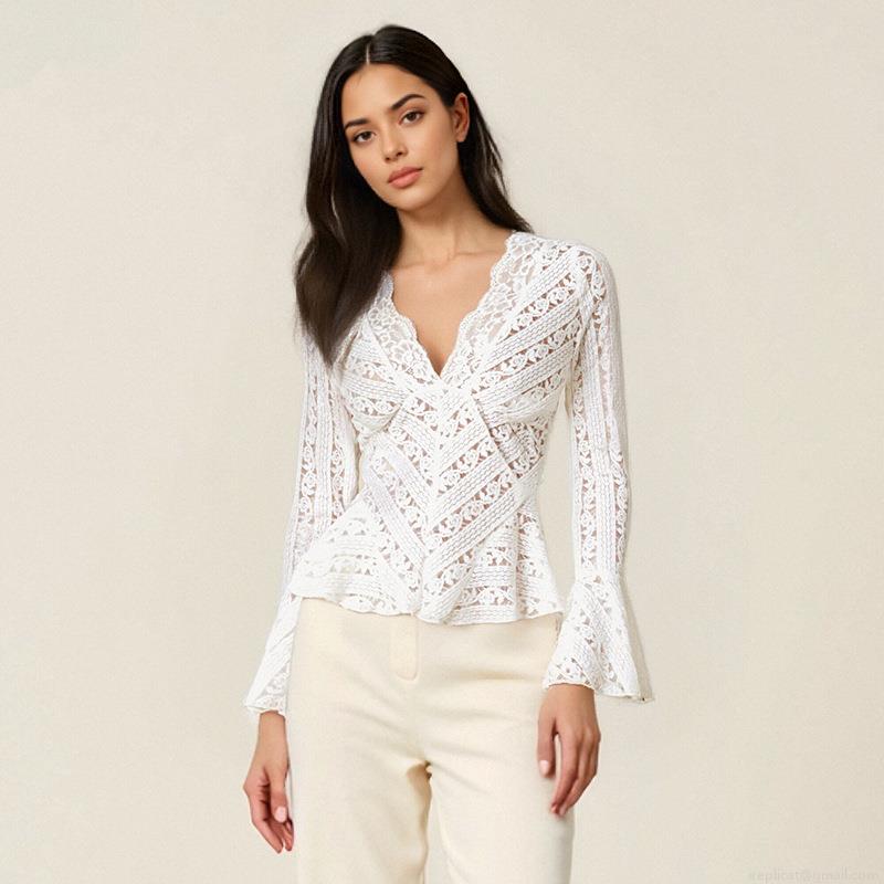 • Women Sexy V Neck Lace T-Shirt Hollow Out Floral Flare Long Sleeve Slim Fit Short Top Elegant White Streetwear Blouse For Ladies