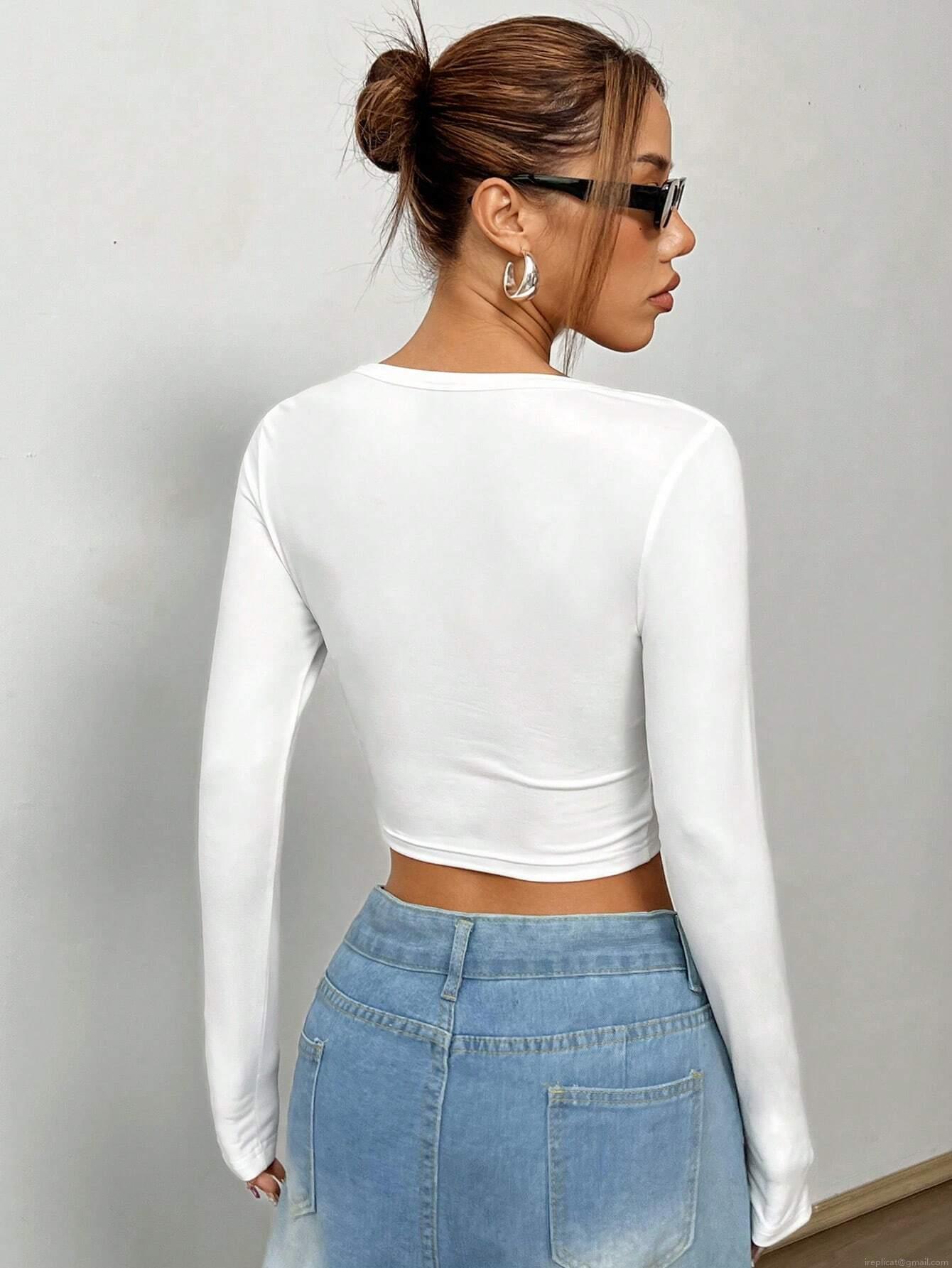 • Women Sexy V Neck Long Sleeve Crop Top 95% Polyester 5% Elastane Solid Color Twisted Front Slim Fit T-Shirt For Daily Party Streetwear