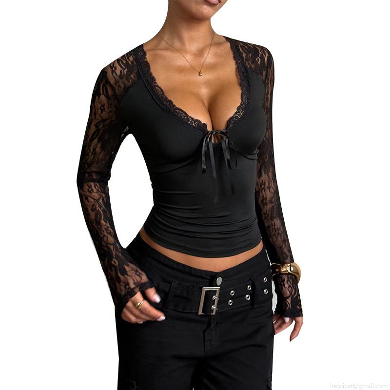 • Women Sexy V Neck Long Sleeve Lace Patchwork Slim Fit T-Shirt Solid Color Black Top with Bow Tie Streetwear Fashion Tee for Autumn