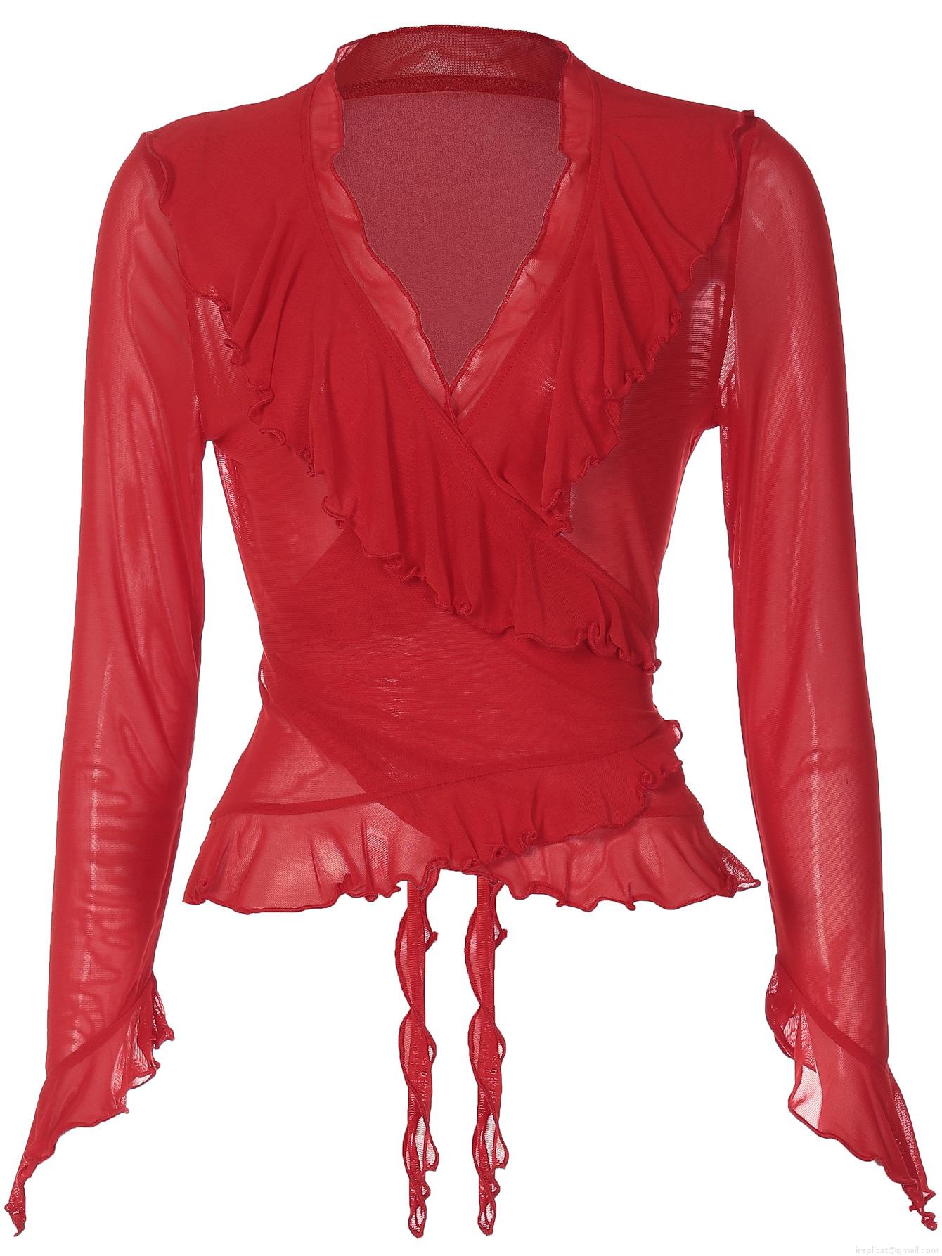 • Women Sexy V Neck Ruffle Mesh Top Slim Fit Sheer Gauze Long Sleeve Flared Cuff Pullover Streetwear Clubwear Party Solid Color Winter Autumn Sexy Tee