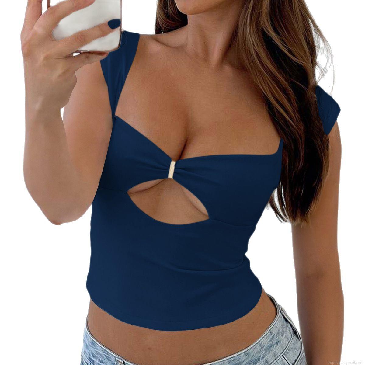 • Women Sexy Y2K Hollow Out T-Shirt Ribbed Knit Slim Fit Short Sleeve Top With Metal Buckle Solid Color Summer Streetwear Clubwear Tee