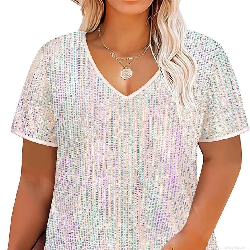 • Women Shiny Sequin V-Neck Short Sleeve T-Shirt Loose Glitter Party Bling Top Polyester Evening Casual Blouse Ladies Clubwear