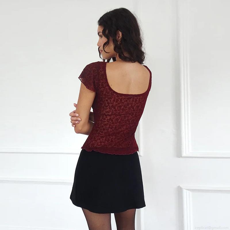 • Women Square Neck Lace T-Shirt Burgundy Floral Short Sleeve Slim Fit Top With Bow Slit Hem Vintage Sexy Summer Mesh Streetwear Tee