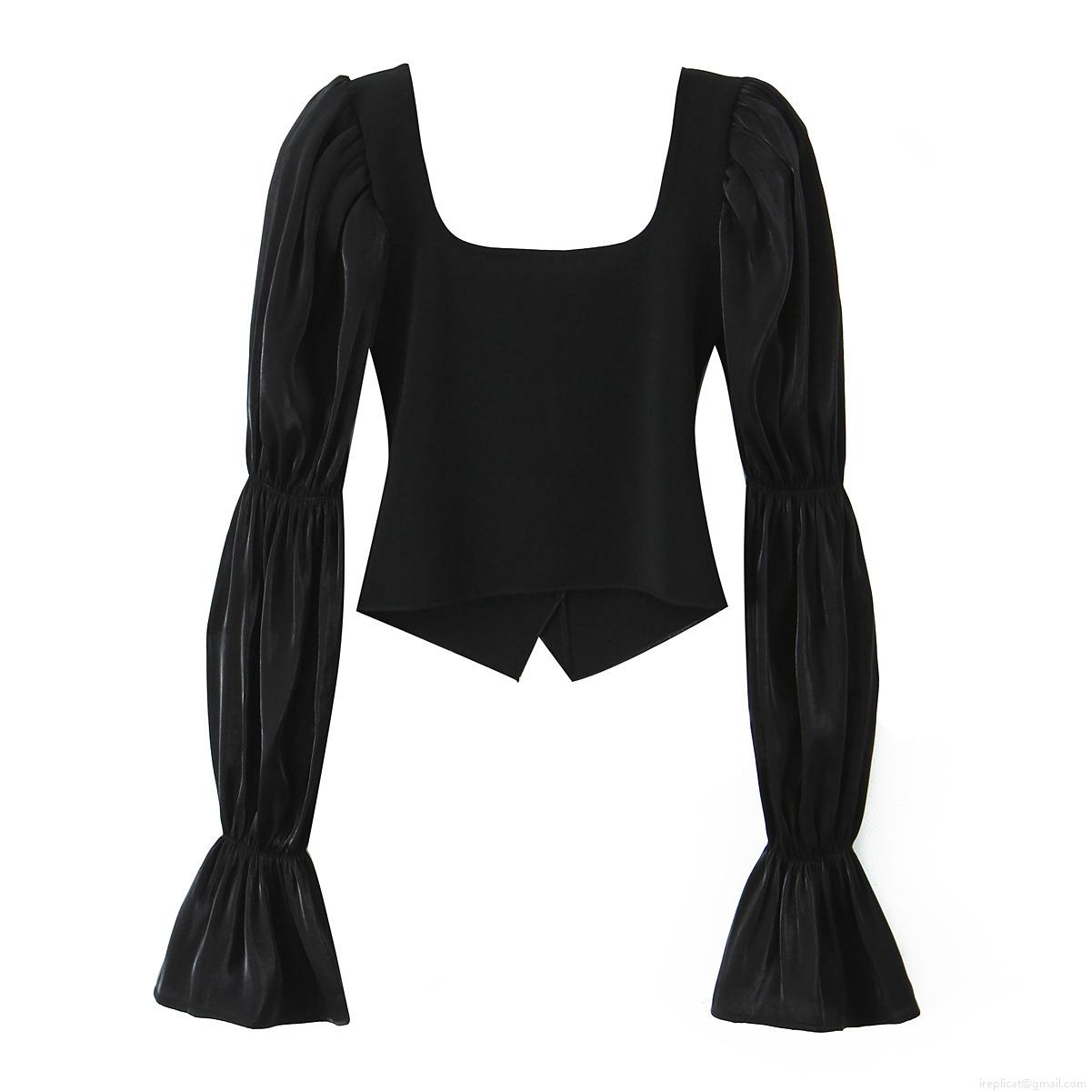 • Women Square Neck Long Sleeve Top Elegant Satin Puff Sleeve Patchwork Blouse With Golden Rose Buttons Slim Fit Black Fashion Streetwear Apparel