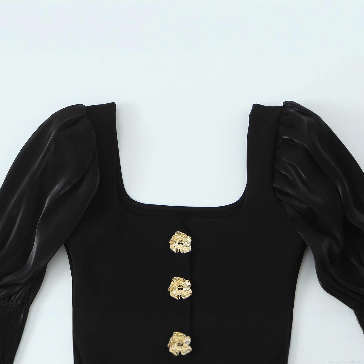 Women Square Neck Long Sleeve Top Elegant Satin Puff Sleeve Patchwork Blouse With Golden Rose Buttons Slim Fit Black Fashion Streetwear Apparel