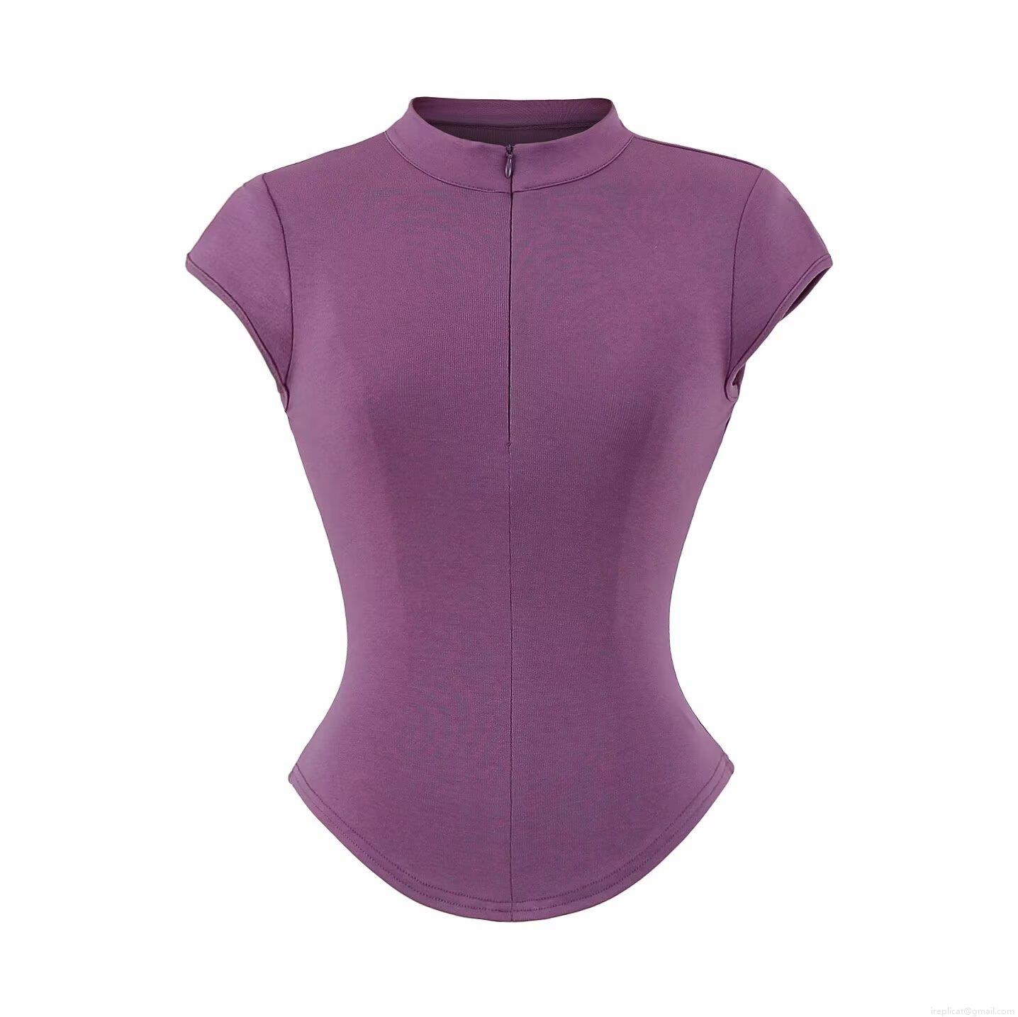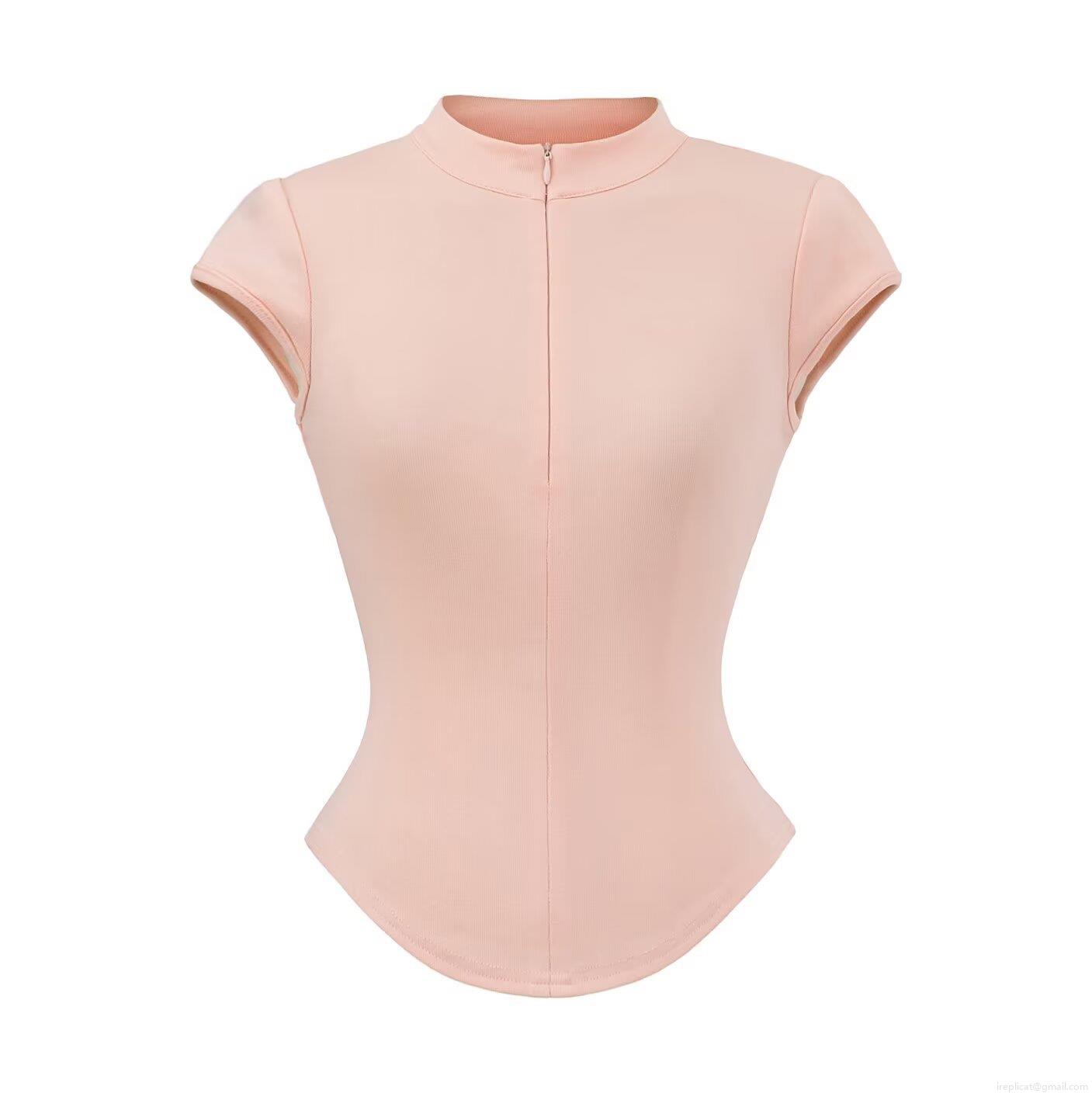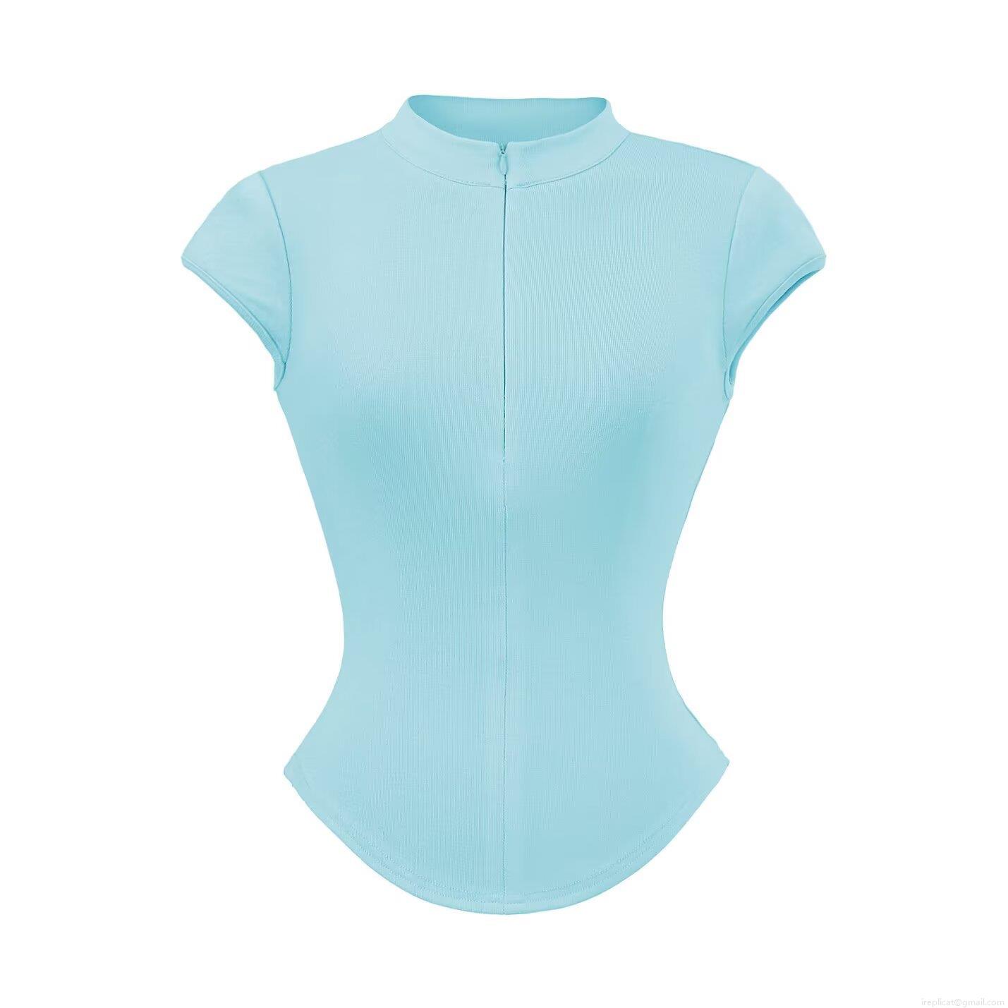 • Women Stand Collar Half Zip Short Sleeve T-Shirt Viscose Elastane Ribbed Slim Fit Rib Knit Top Summer Streetwear Solid Color Casual Tee