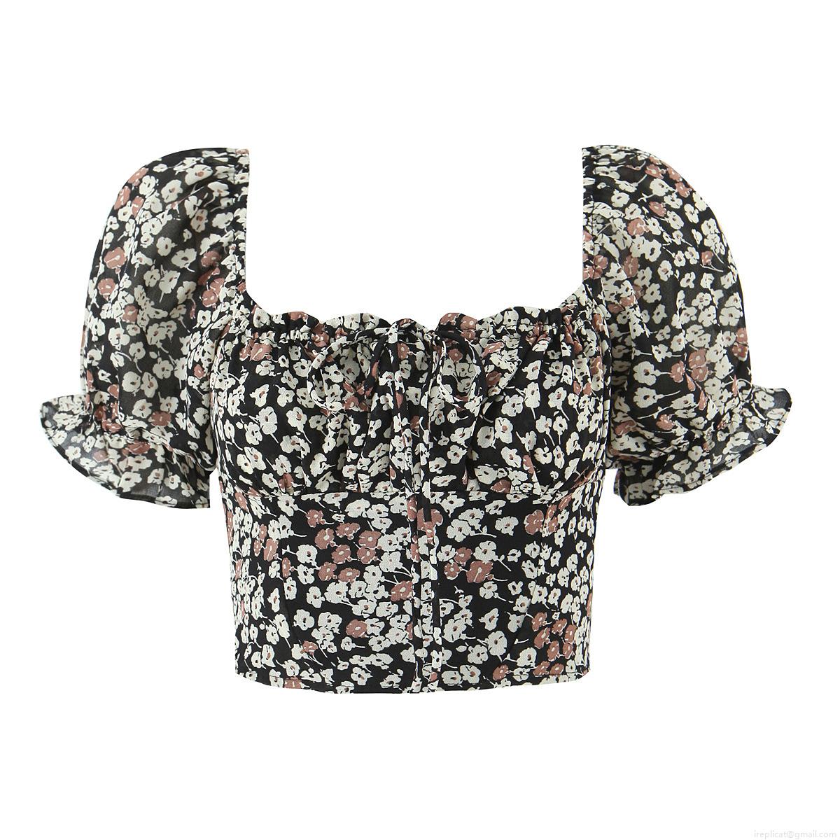 • Women Summer Floral Gingham Print Crop Top Square Neck Puff Sleeve Drawstring Bow Slim Fit 100% Polyester T-Shirt Streetwear Short Sleeve Blouse