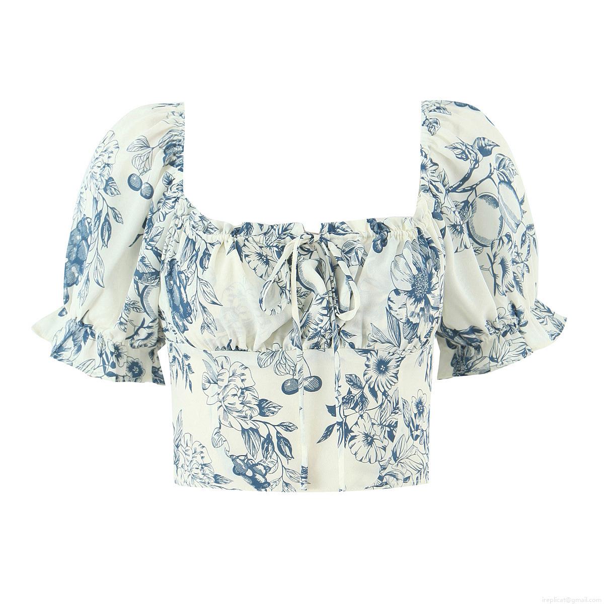 Bow, Floral Pattern, Checkered Pattern, Ruffles, Printing, Drawstring, Plant-based Printing, Puff Sleeves, Square Collar, Pleated Elasticity, Citrus Fruits