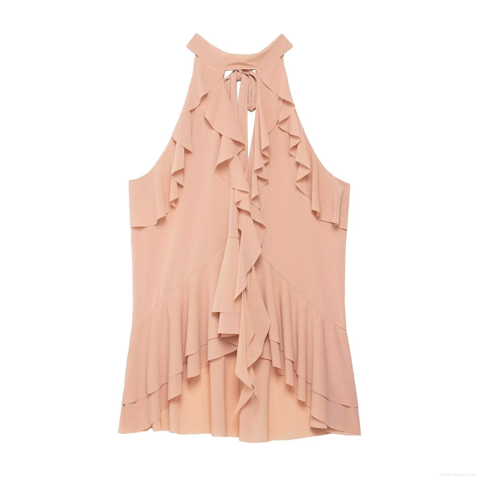 • Women Summer Halter Neck Polyester Chiffon Top Sleeveless Layered Ruffle Decoration Back Bow Tie T-Shirt Elegant Streetwear Casual Sexy Blouse For Women