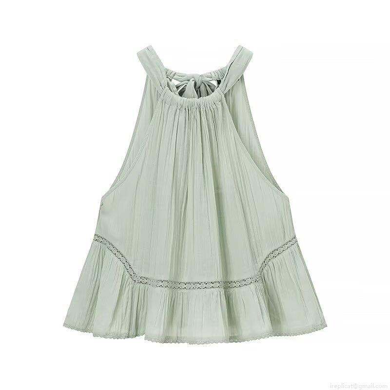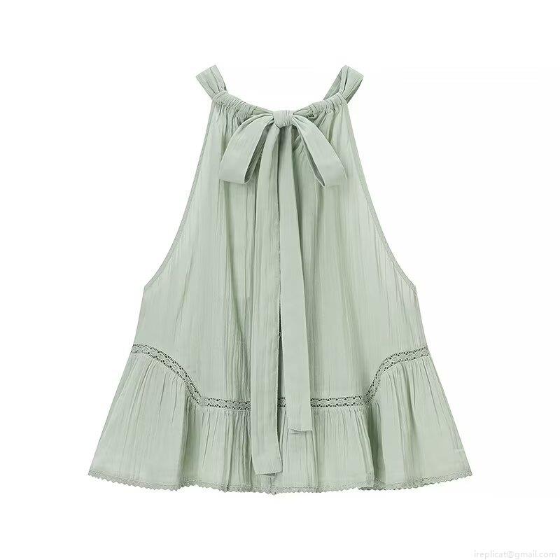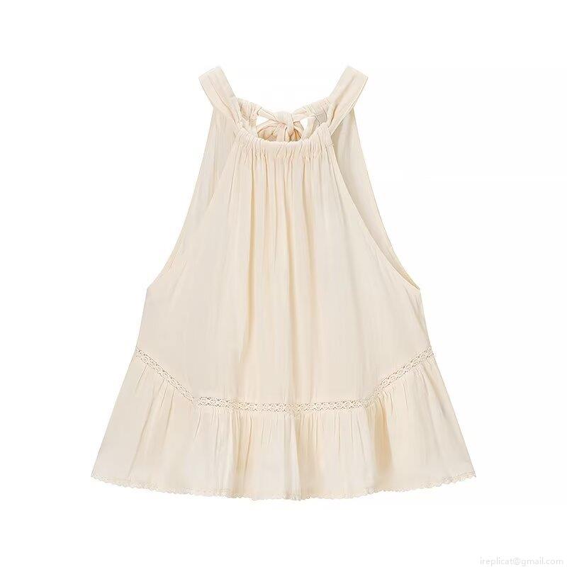 • Women Summer Halter Neck Sleeveless T-Shirt Casual Loose Solid Color Pleated Top With Crochet Lace Patchwork Ruffle Hem Back Tie-up Vest