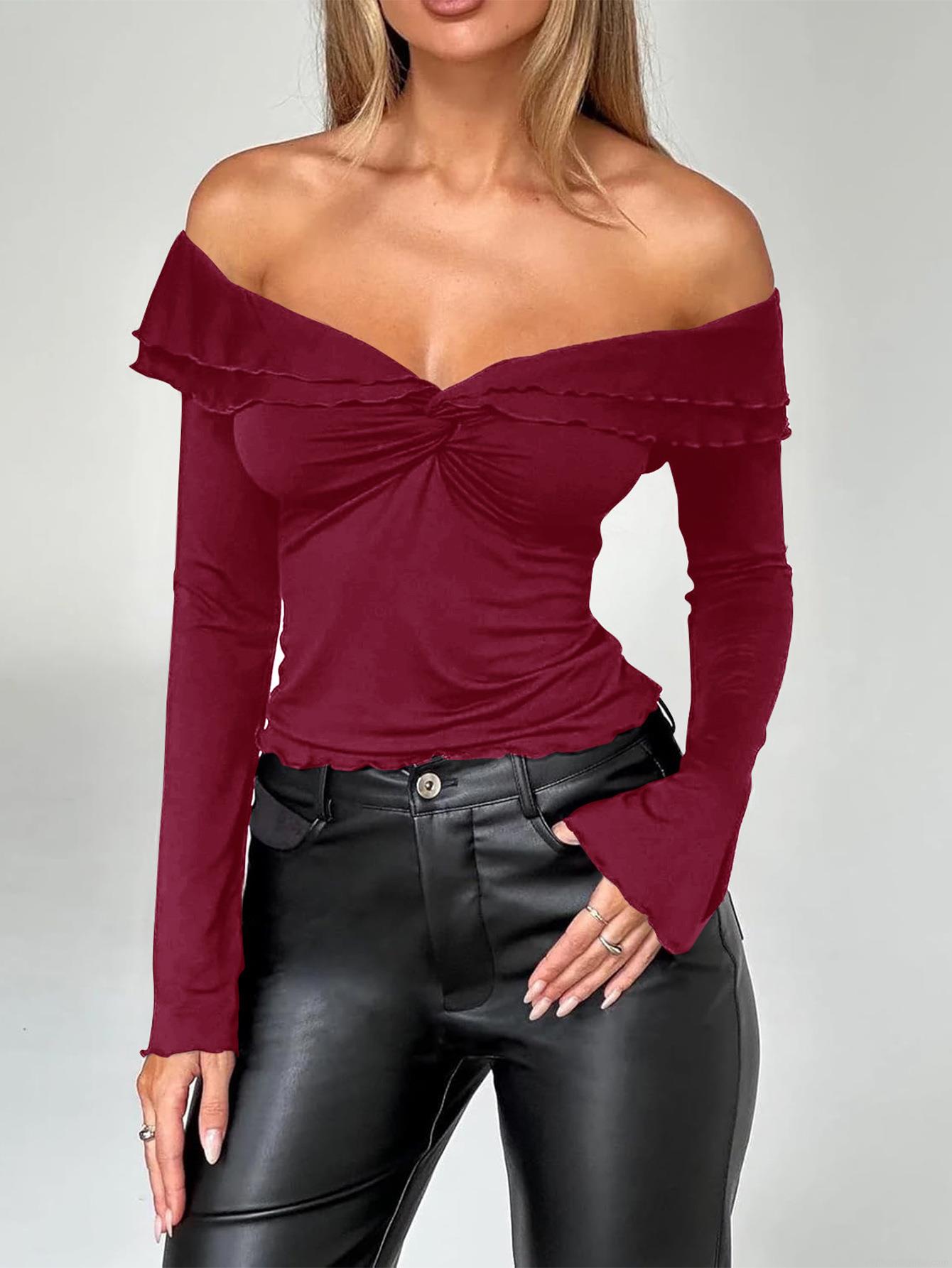 • Women Y2K Sexy Off Shoulder Long Sleeve T-Shirt Ruffle Ruched Knot Front Slim Fit Viscose Spandex Top Elegant Solid Color Bell Sleeve For Autumn Winter Party Clubwear