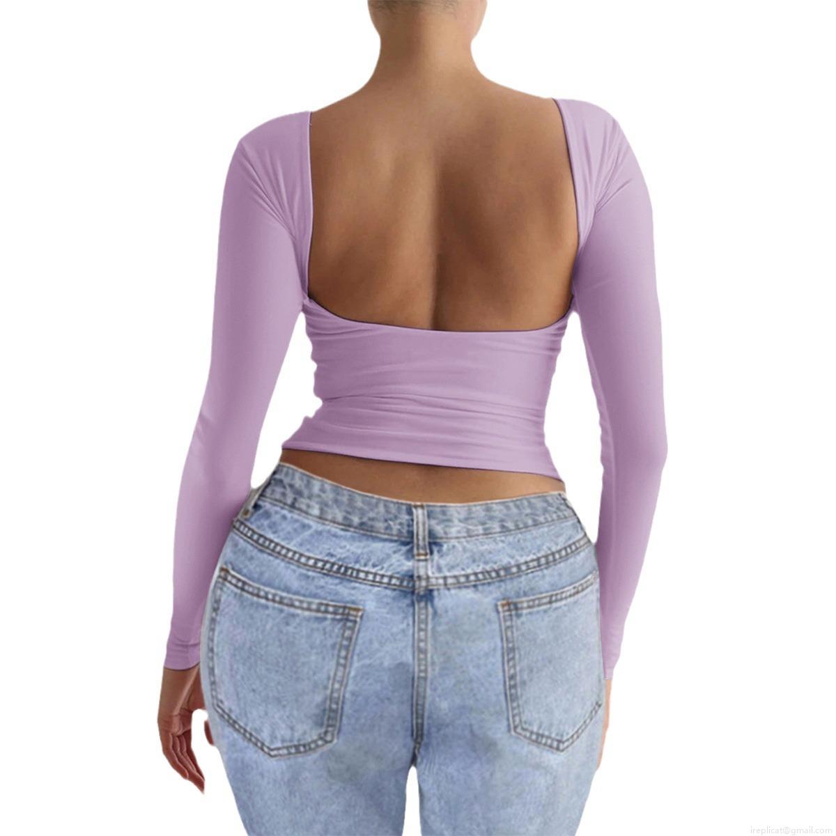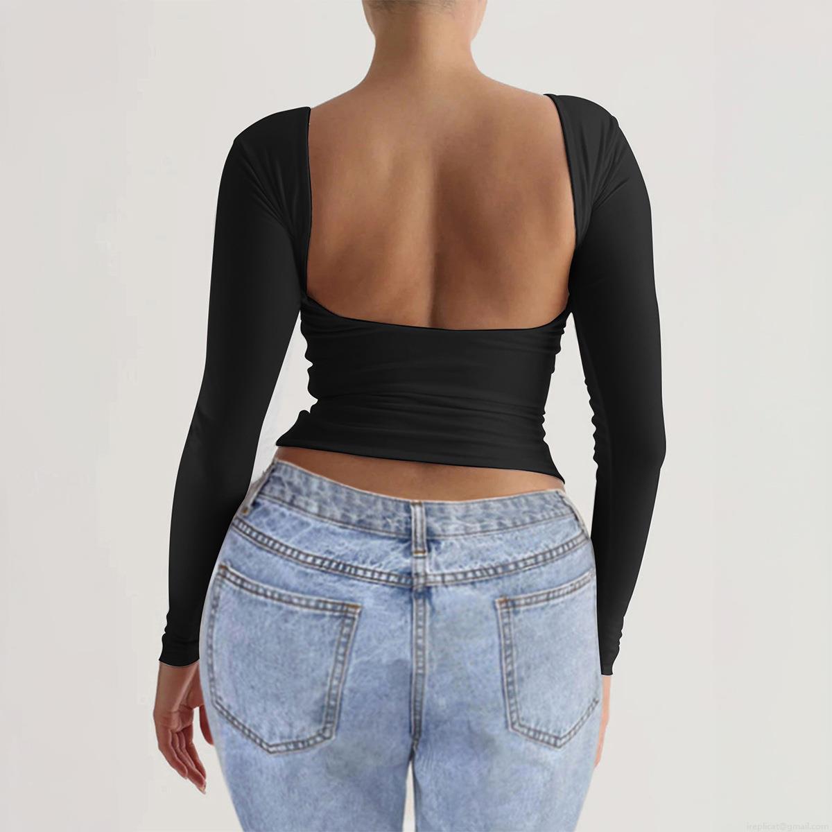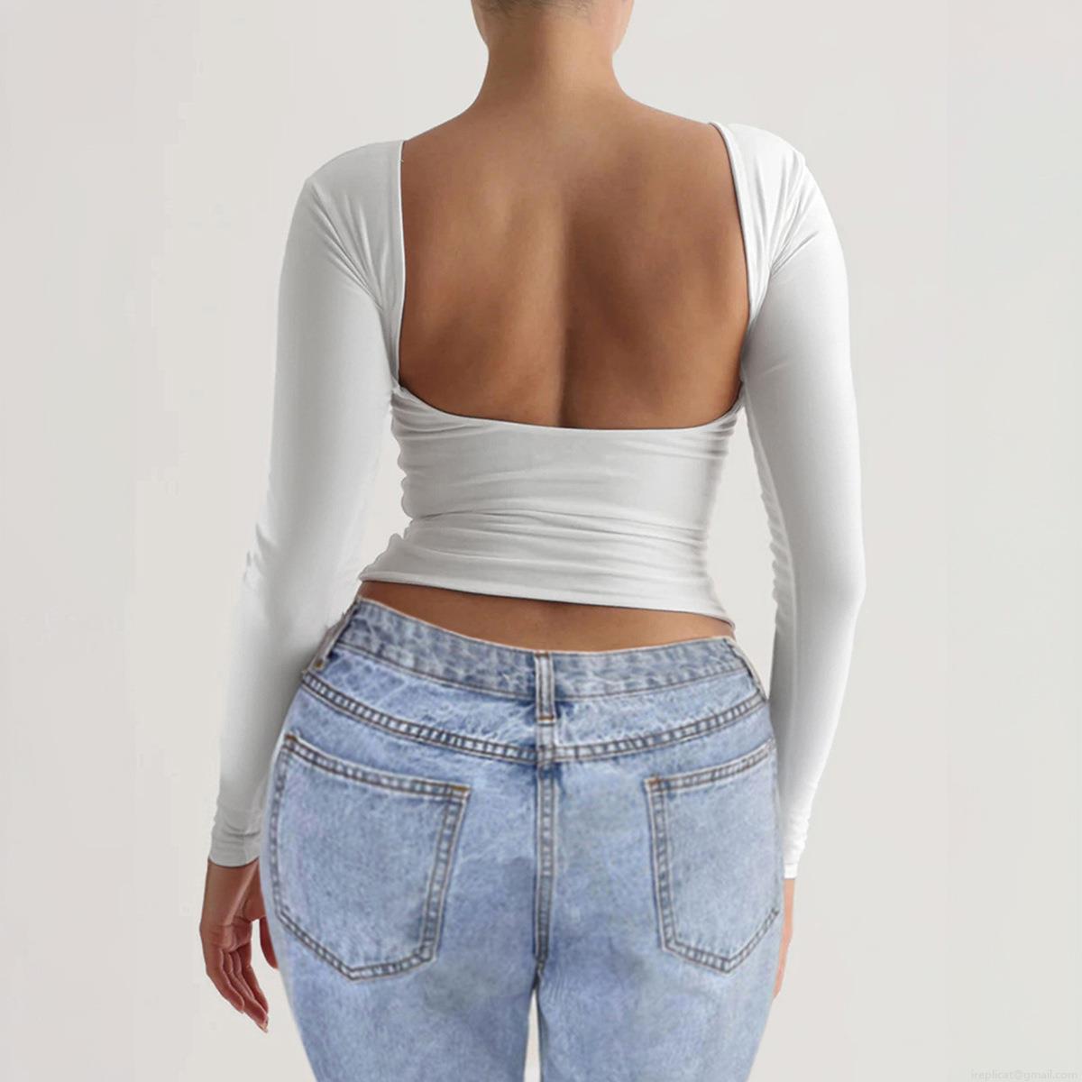 • Women Y2K Sexy Open Back T-Shirt Round Neck Long Sleeve Slim Fit Knit Top Ruched Solid Color Backless Pullover Autumn Winter Casual Tee