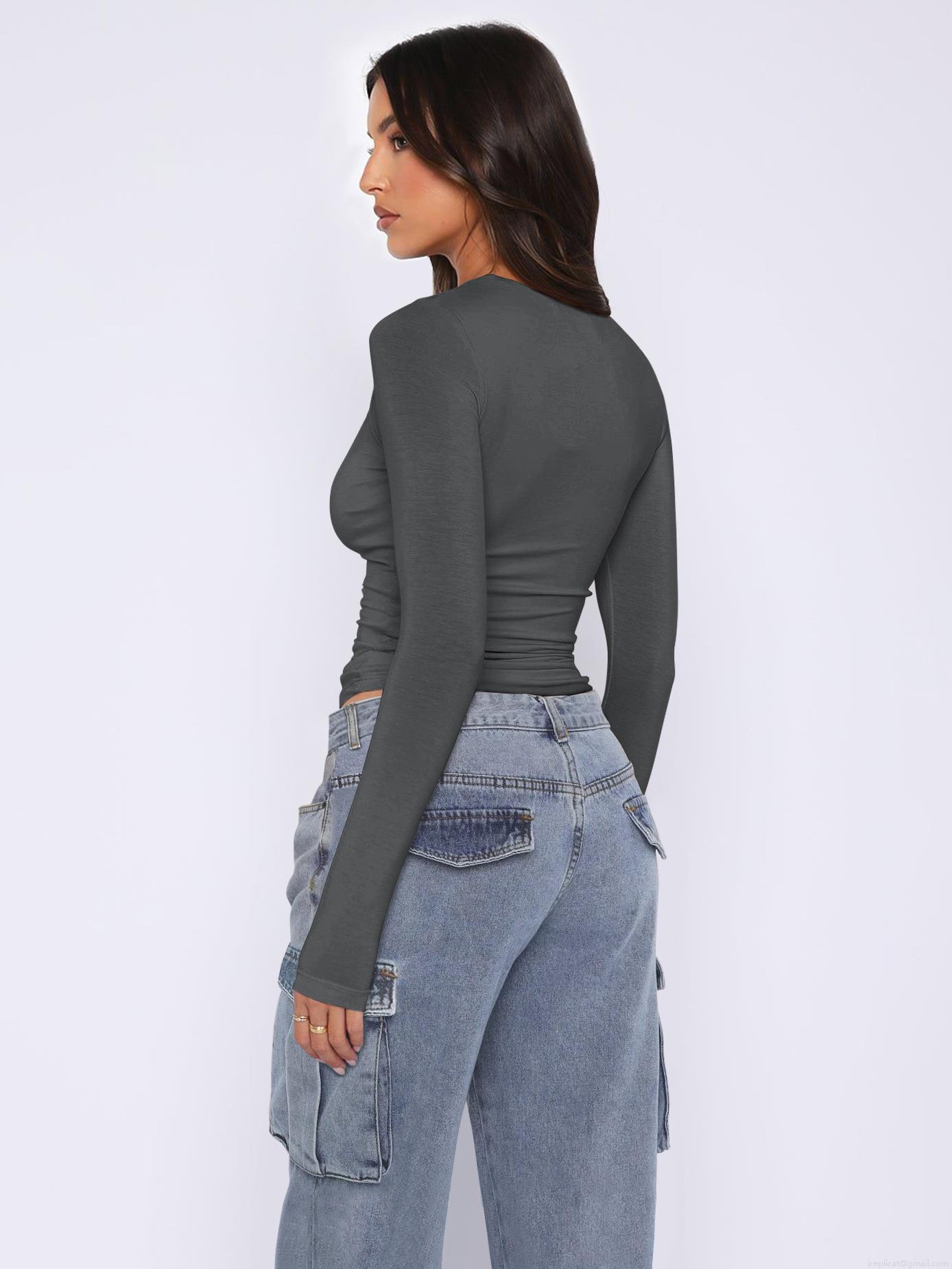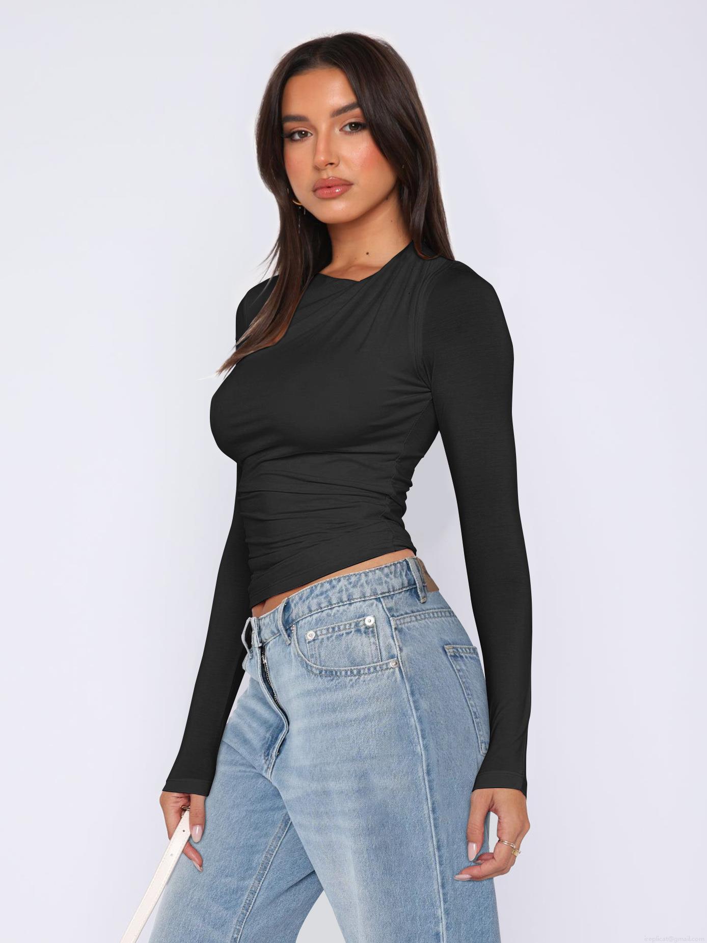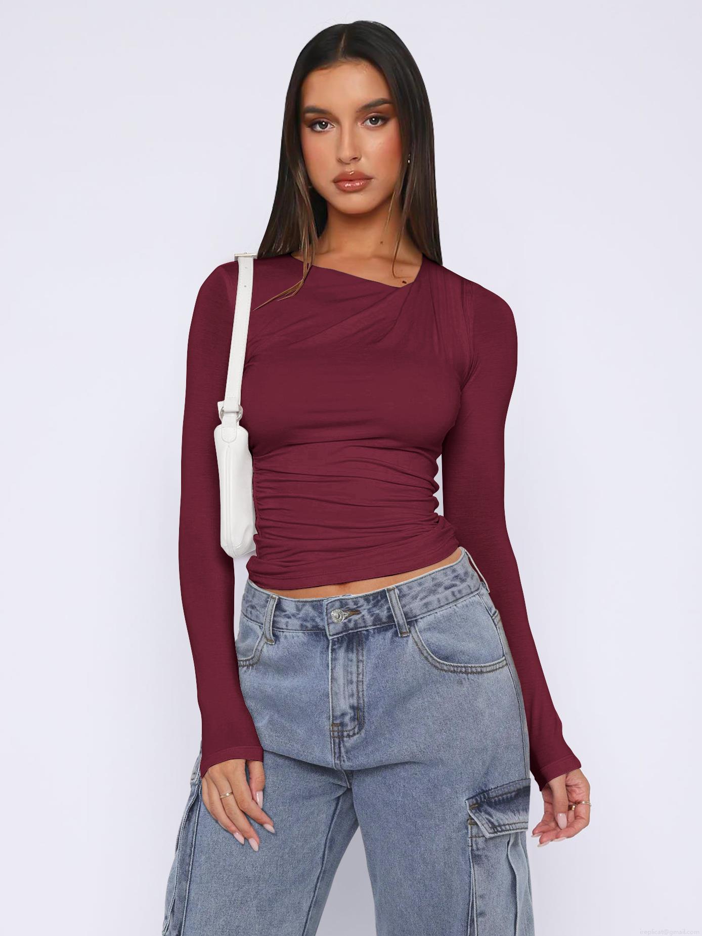 • Women Y2K Sexy Slim Fit Crop Top Long Sleeve Viscose Ruched T-Shirt With Irregular Neck Solid Color Casual Top For Lady Party Date Outwear