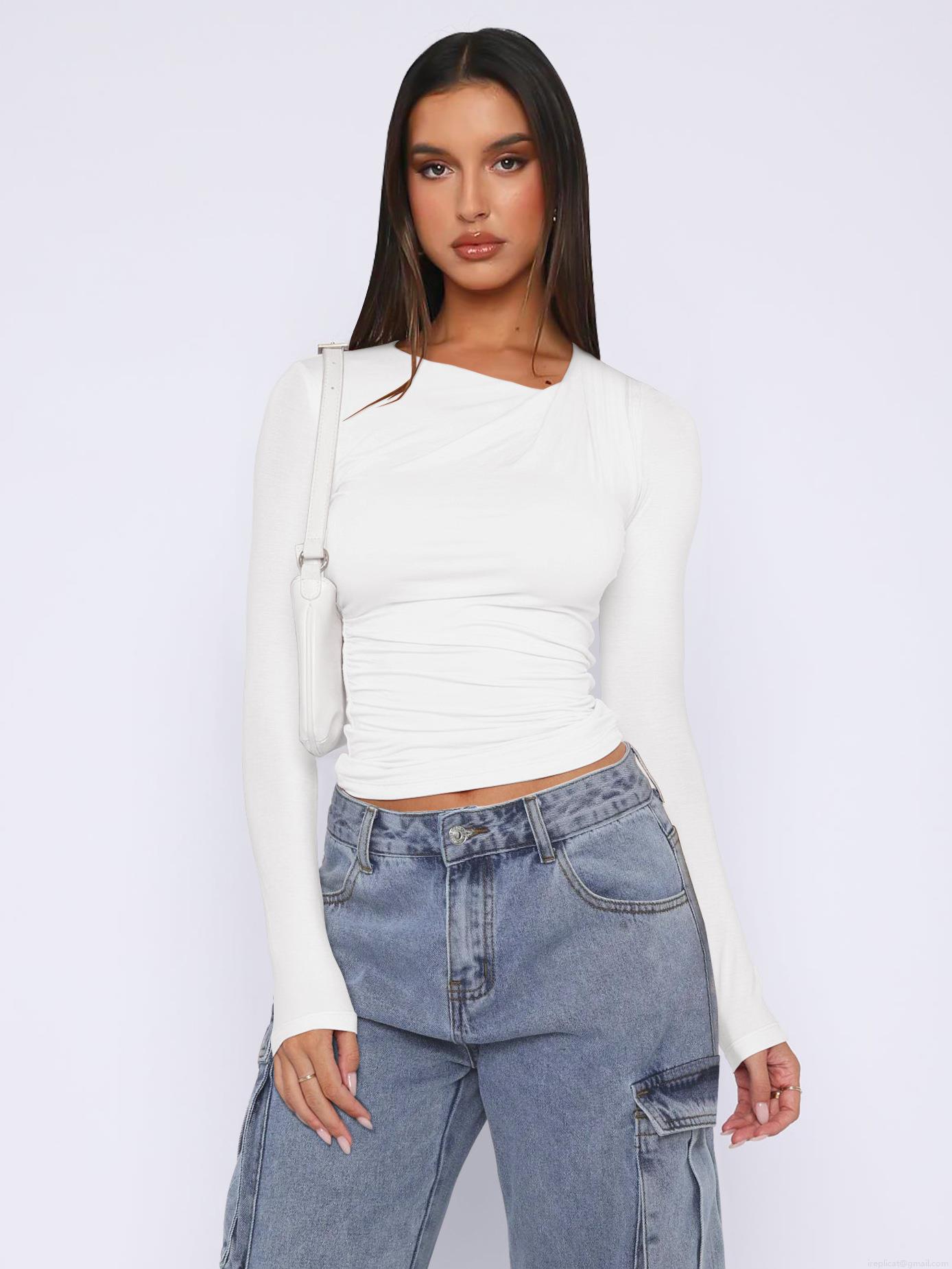 Women Y2K Sexy Slim Fit Crop Top Long Sleeve Viscose Ruched T-Shirt With Irregular Neck Solid Color Casual Top For Lady Party Date Outwear