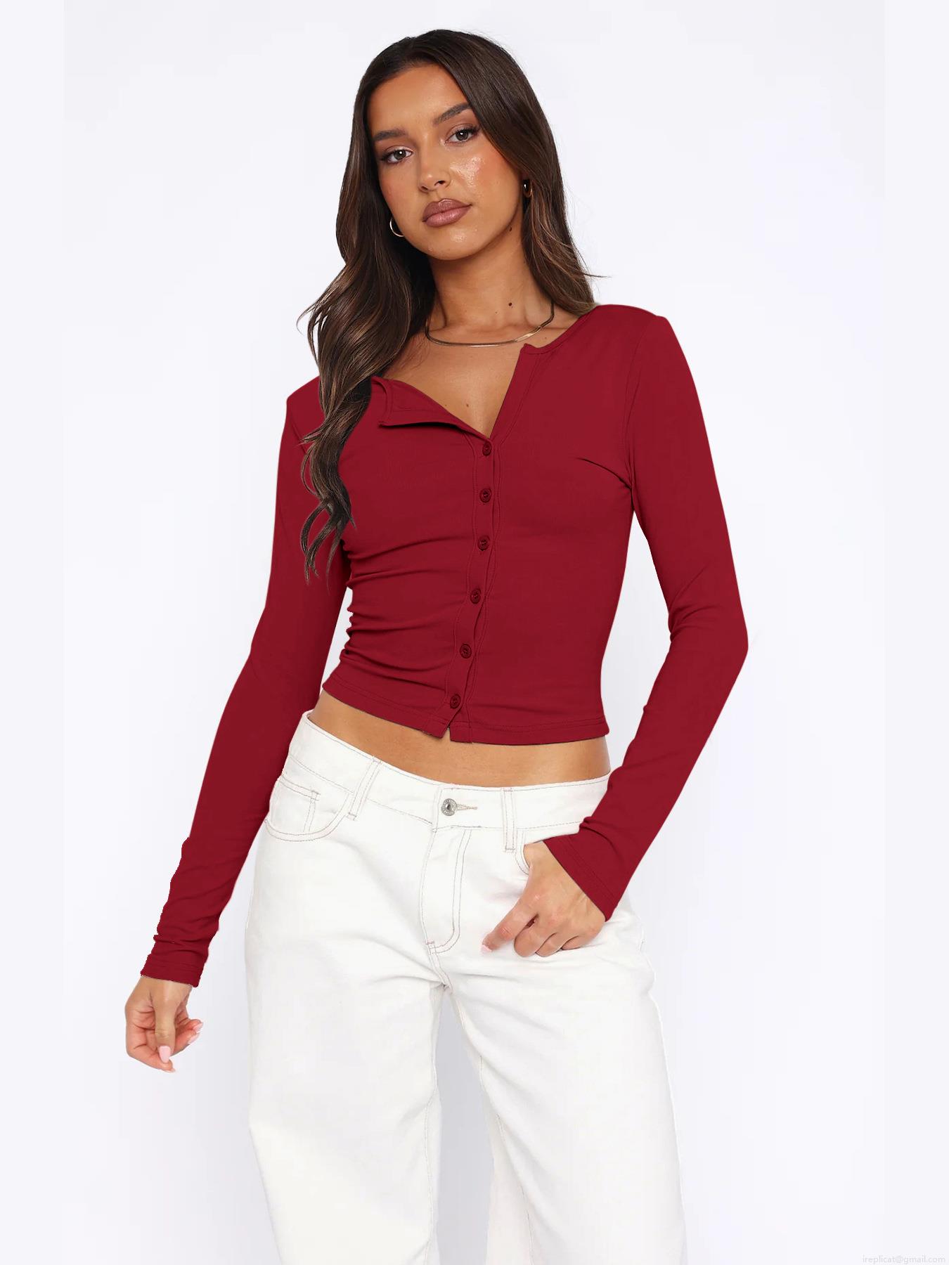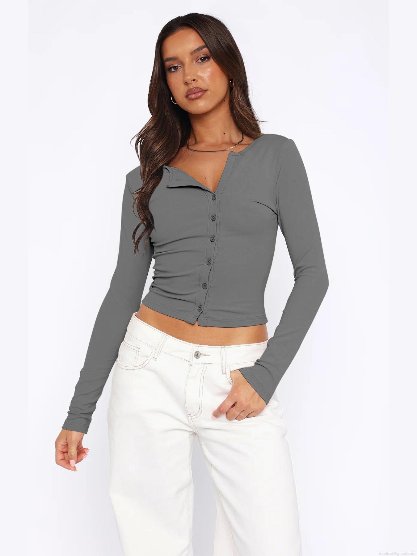 • Women Y2K Slim Fit Long Sleeve Knit Cardigan Ribbed Button Down V-Neck Cropped Tee Top Basic Solid Color Casual Commute Streetwear Spicy Girl Tops