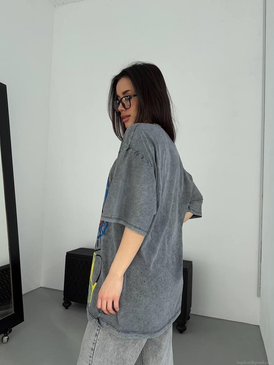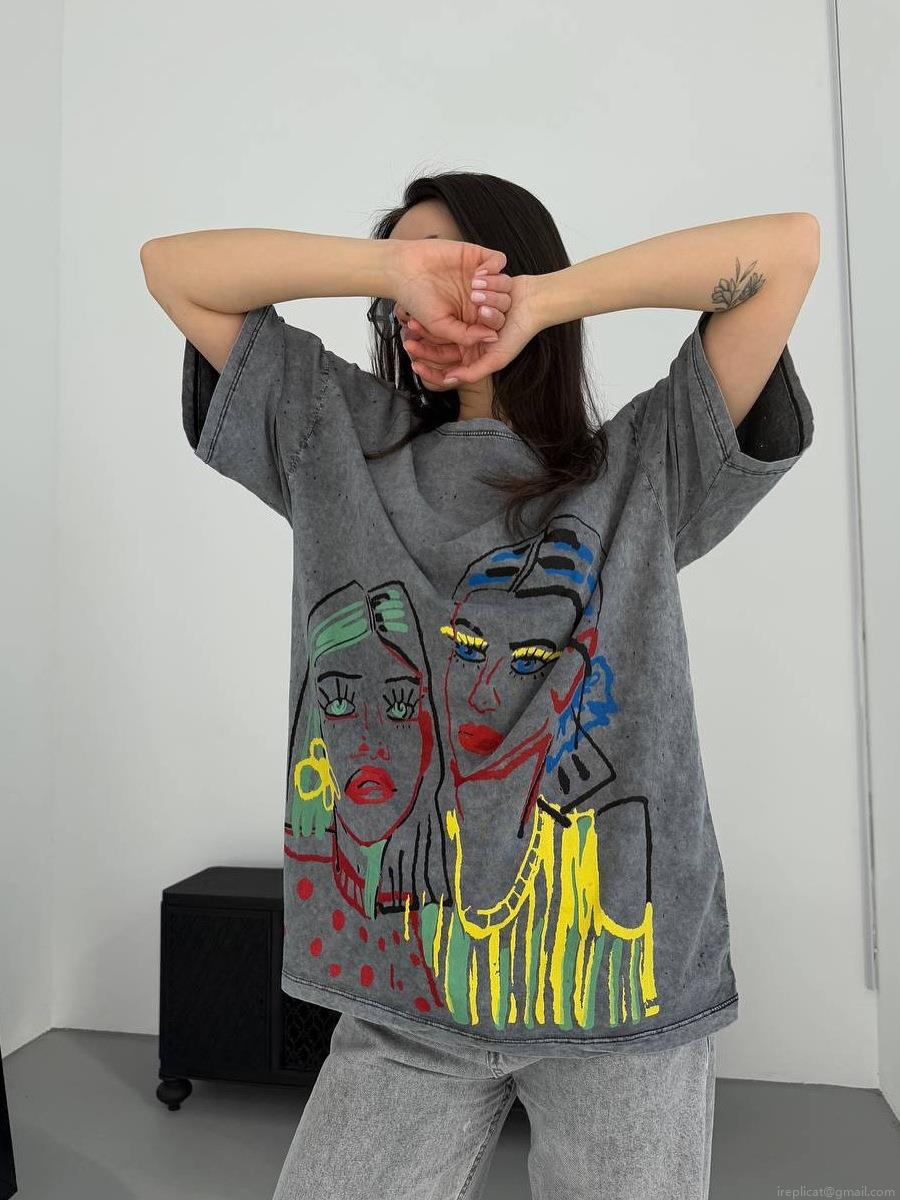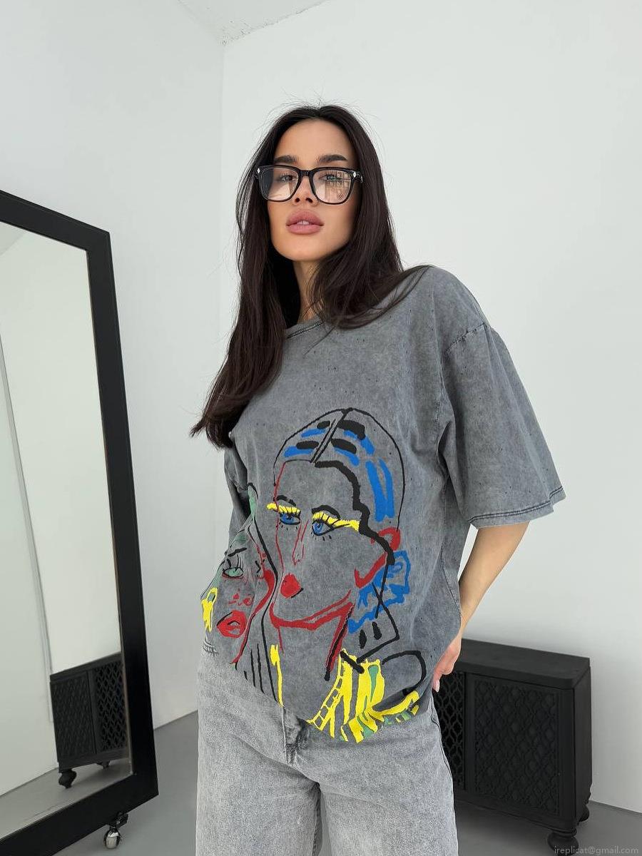 • Women's 100% Cotton Oversized T-Shirt Vintage Acid Wash Grey Short Sleeve Top With Abstract Portrait Art Print Casual Streetwear Fashion Tee