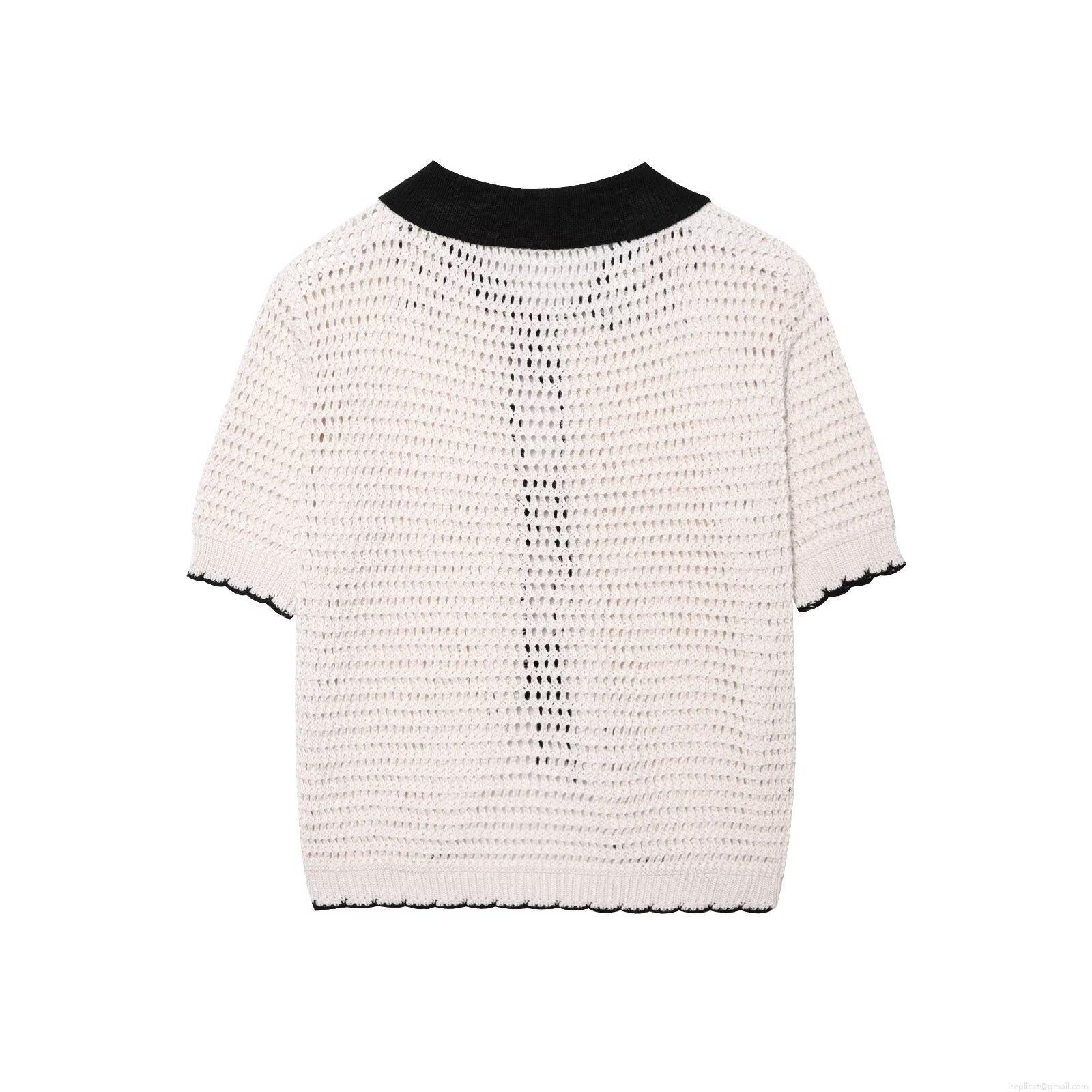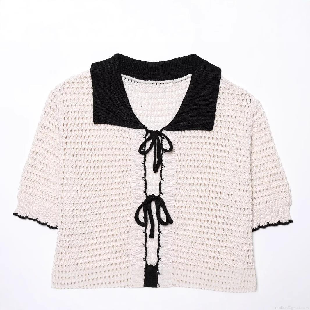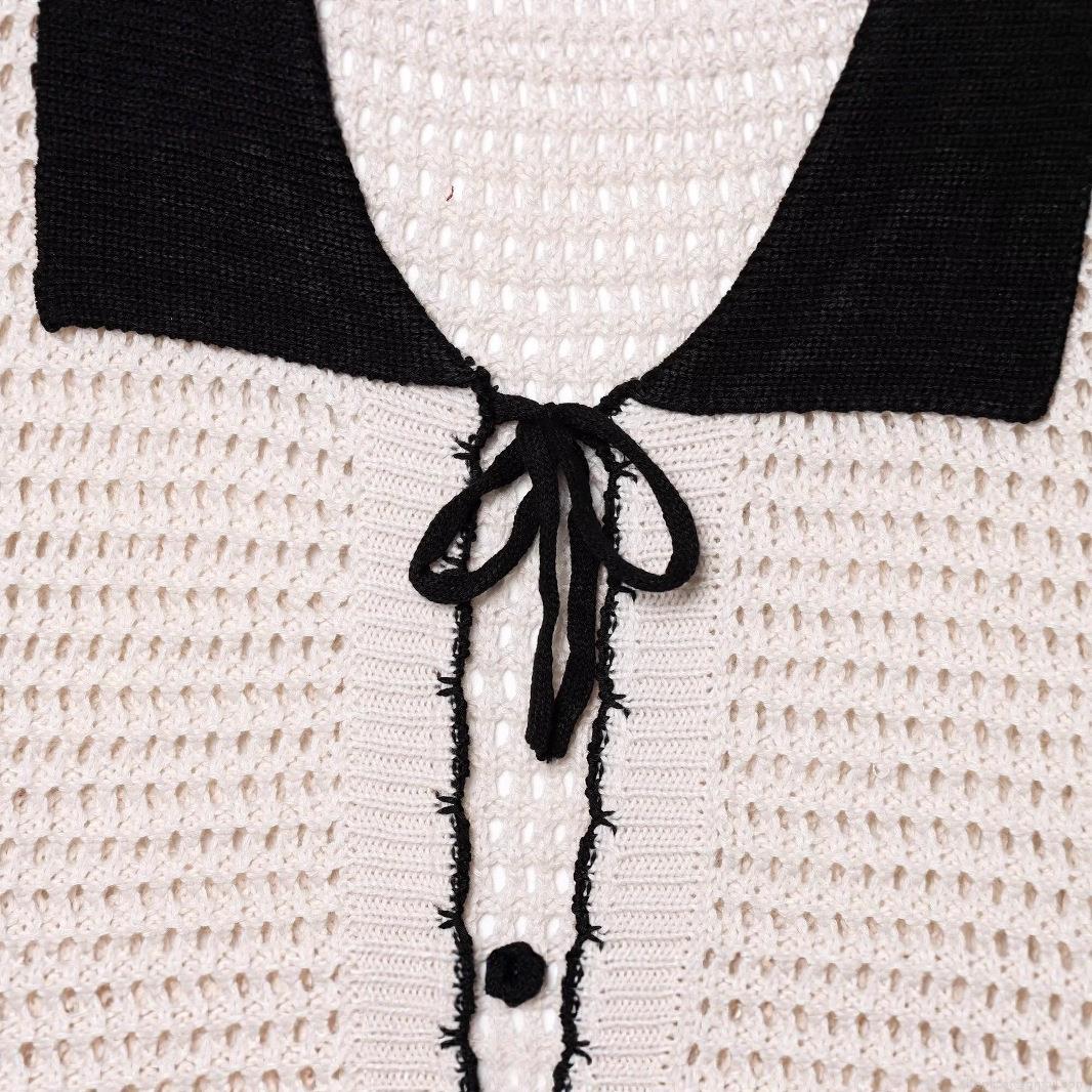 • Women's American Retro Sexy Hot Girl Style Crochet Polo Shirt Hollow Out Knit Top With Bow Tie Color Block Short Sleeve Breathable Summer Streetwear Cardigan For Women